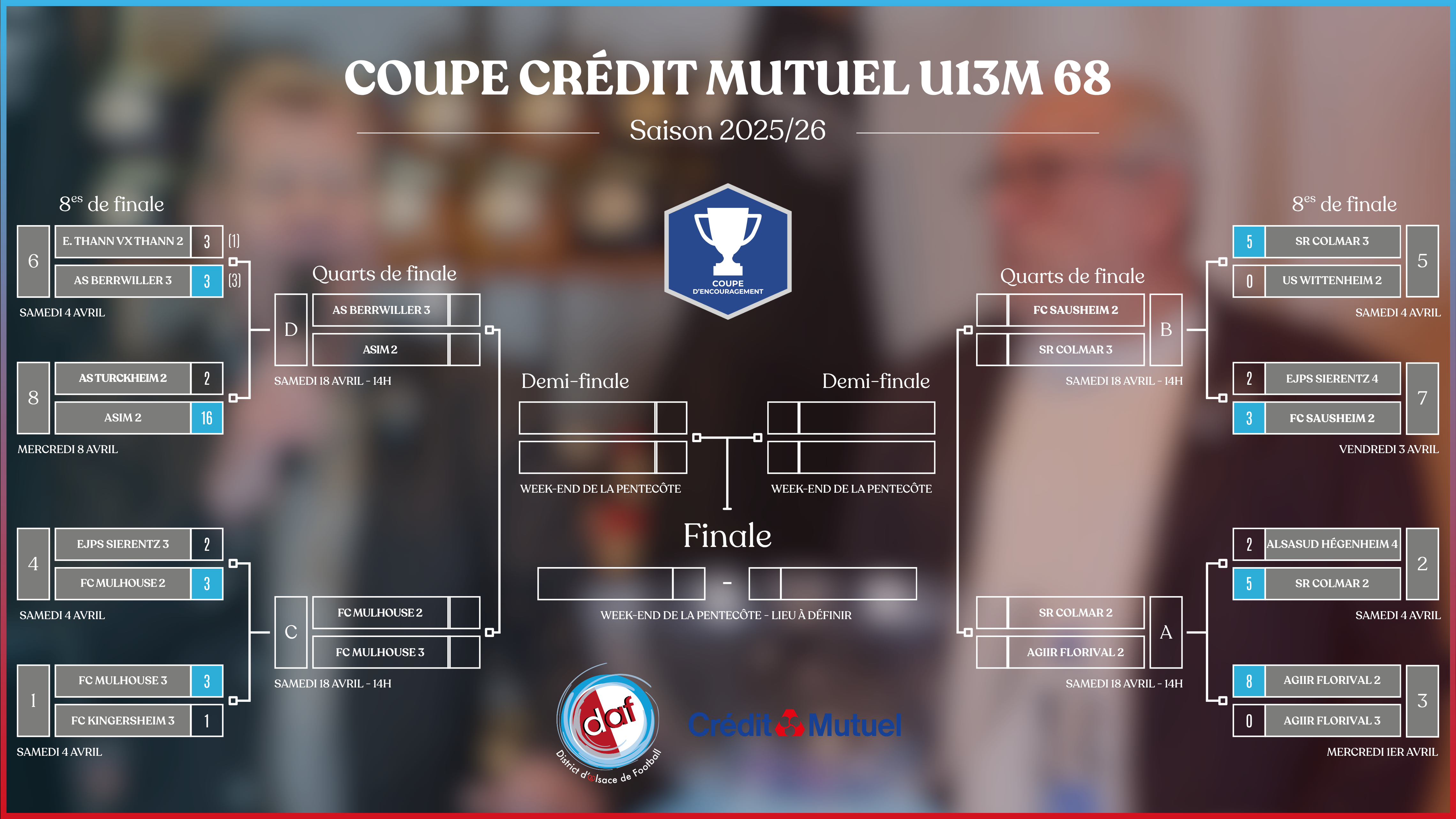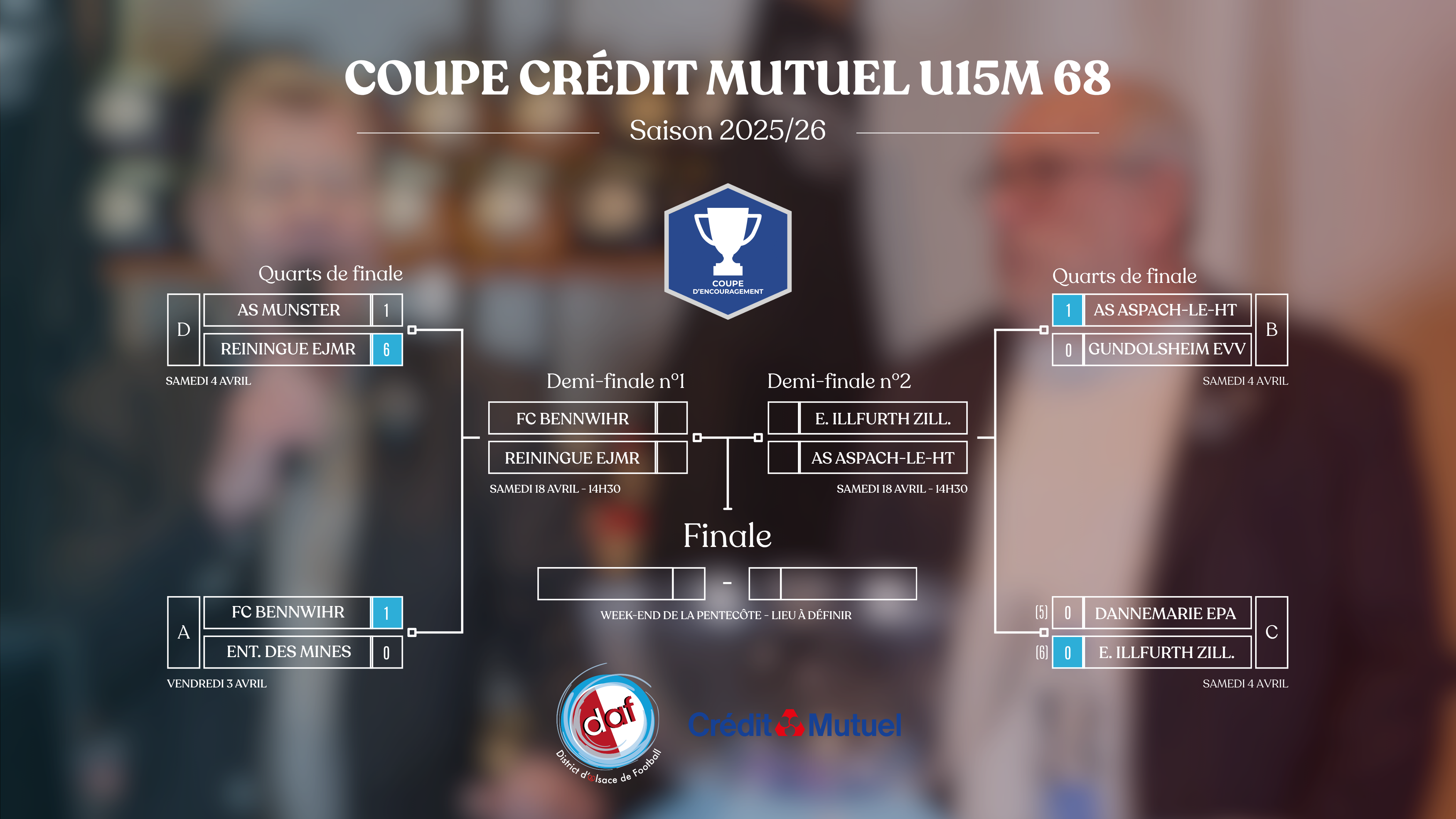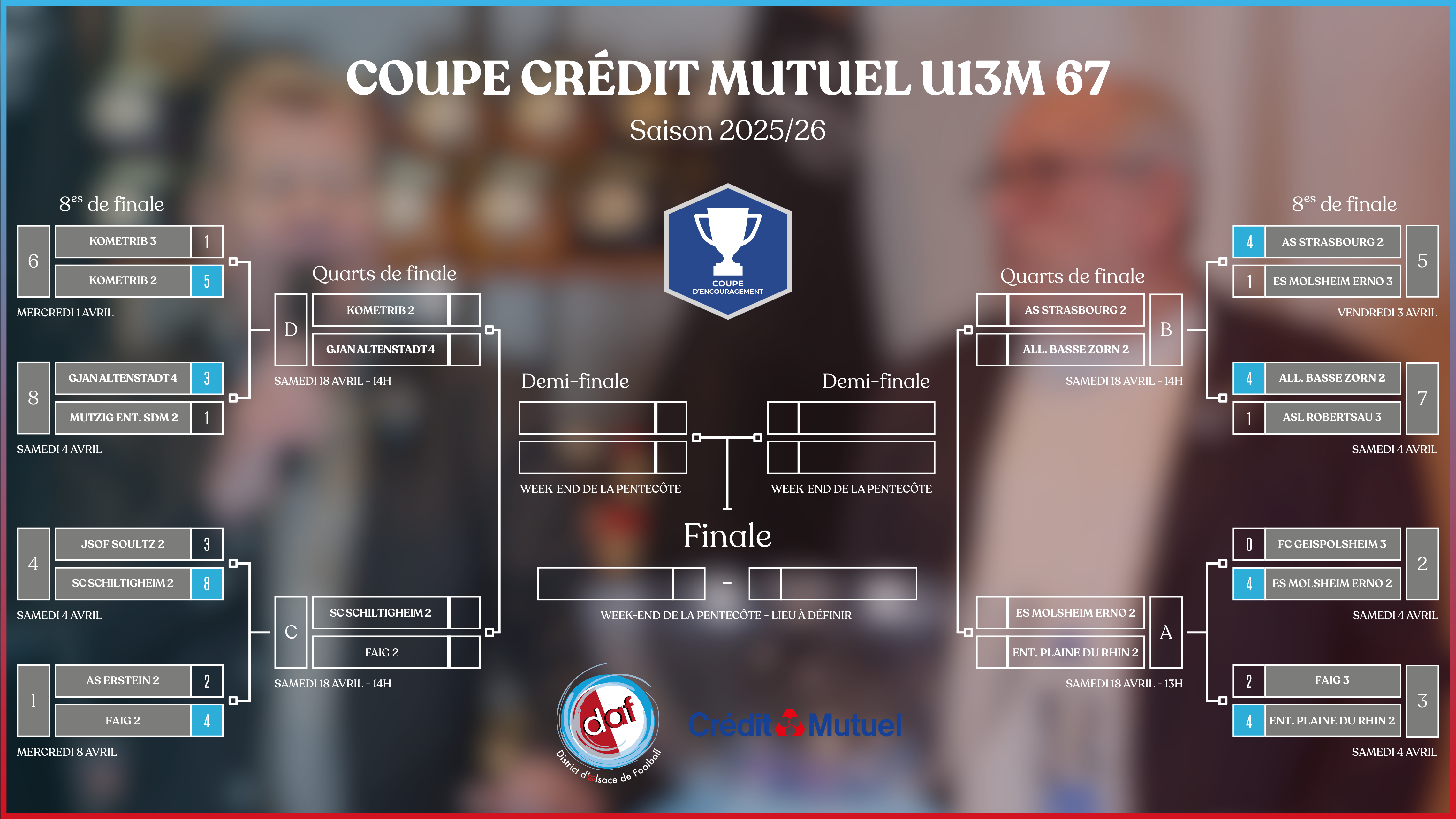 Retrouvez ici tous les tableaux finaux (8es, quarts et demi-finales) des différentes coupes et challenges du District d’Alsace de Football pour la saison 2025/2026.