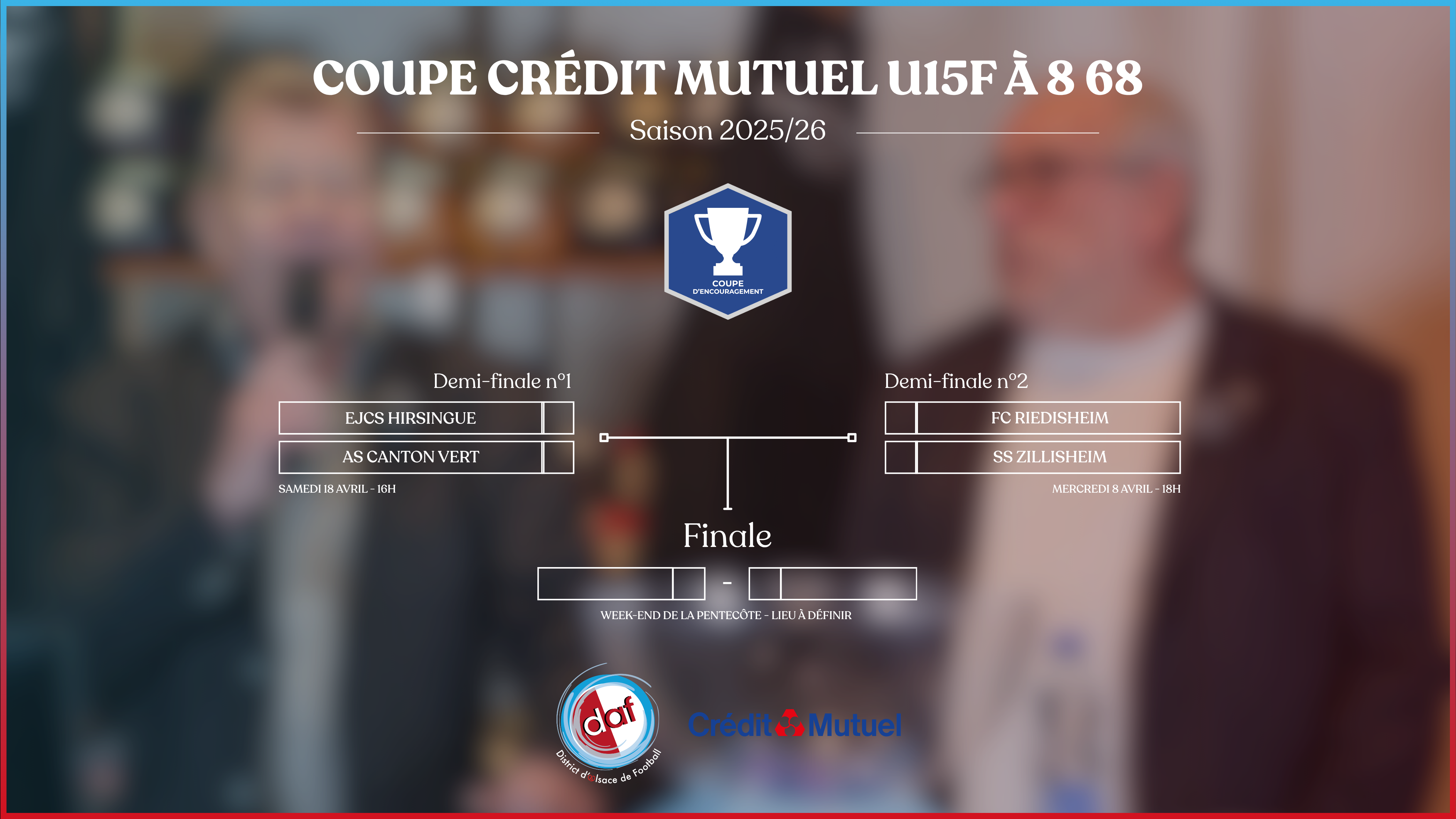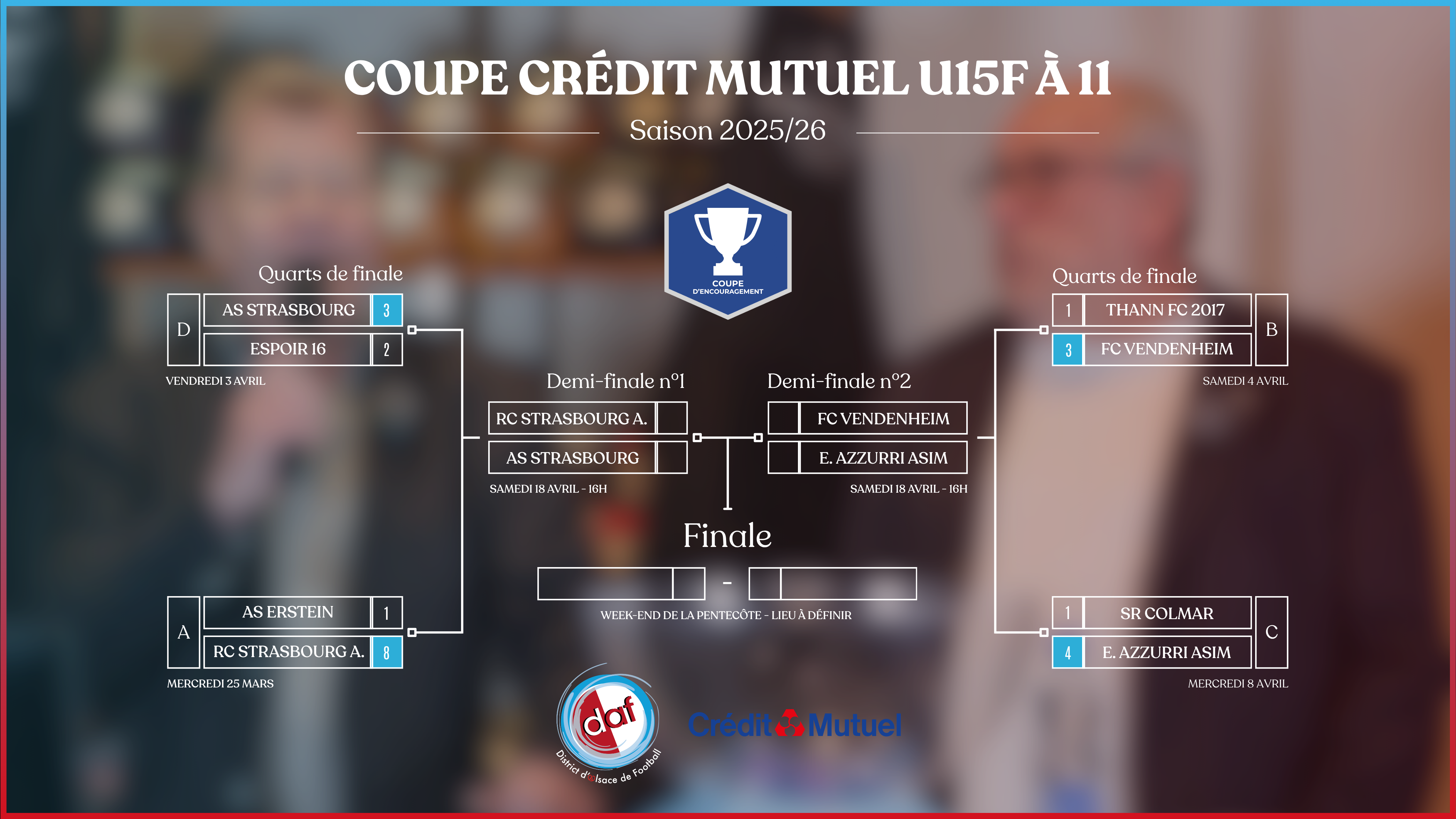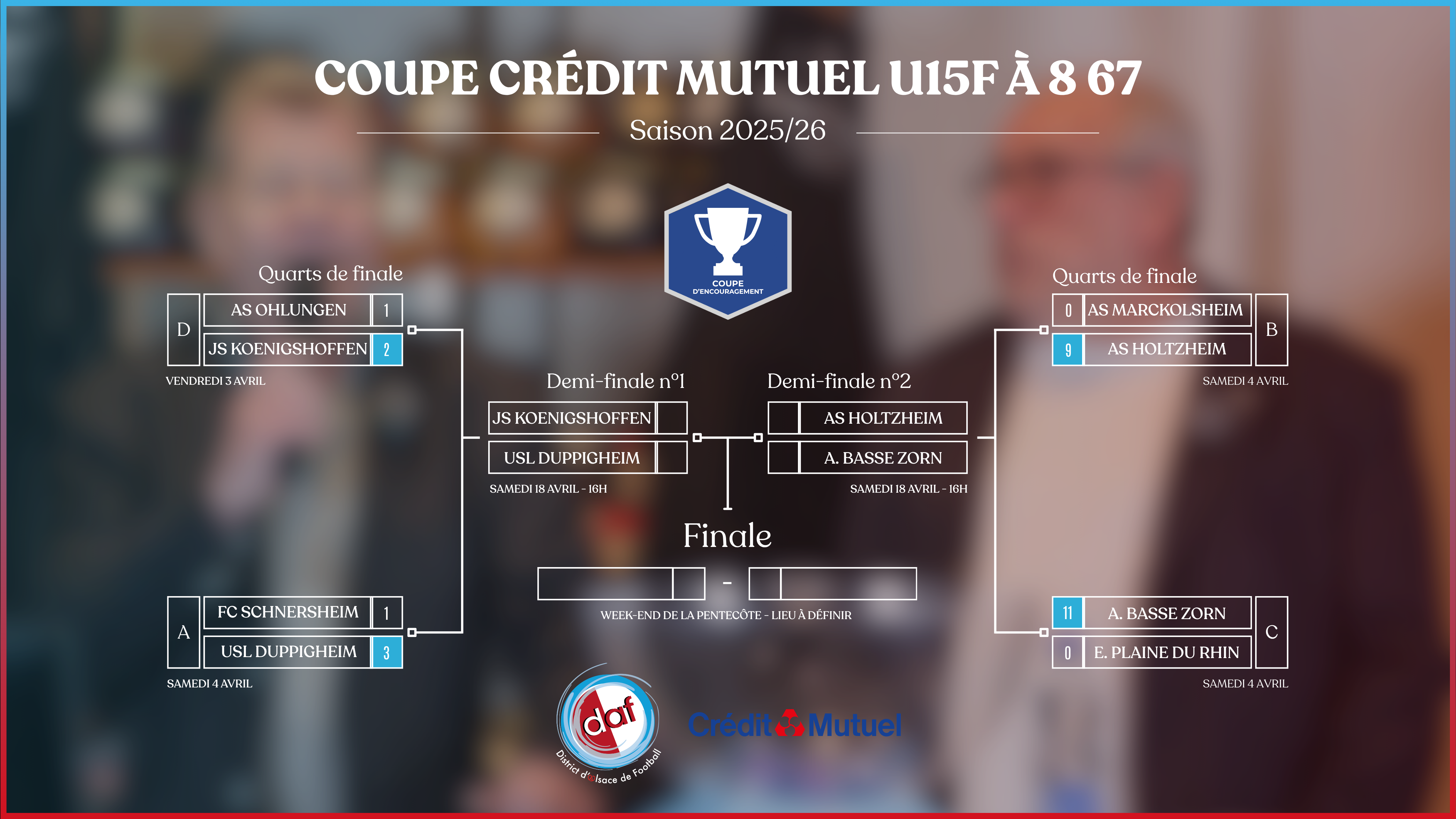 Retrouvez ici tous les tableaux finaux (8es, quarts et demi-finales) des différentes coupes et challenges du District d’Alsace de Football pour la saison 2025/2026.