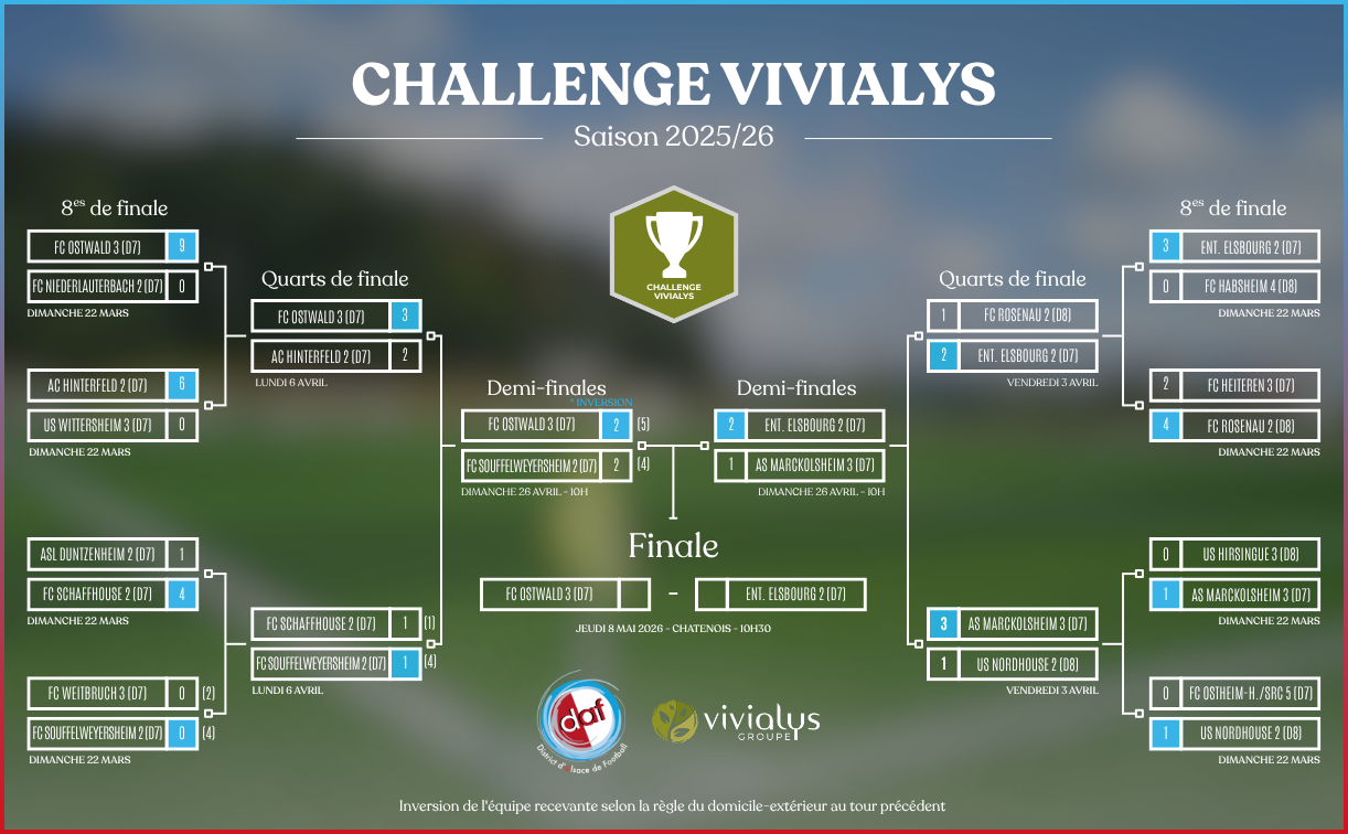 • Le tirage au sort du tableau final (8es, quarts, demi-finales) du Challenge Vivialys est programmé le jeudi 5 mars 2026 à 12h au siège du District d’Alsace de Football à Entzheim, hors présence des clubs. Il sera à suivre en direct à partir sur la page Facebook du District d’Alsace de Football.