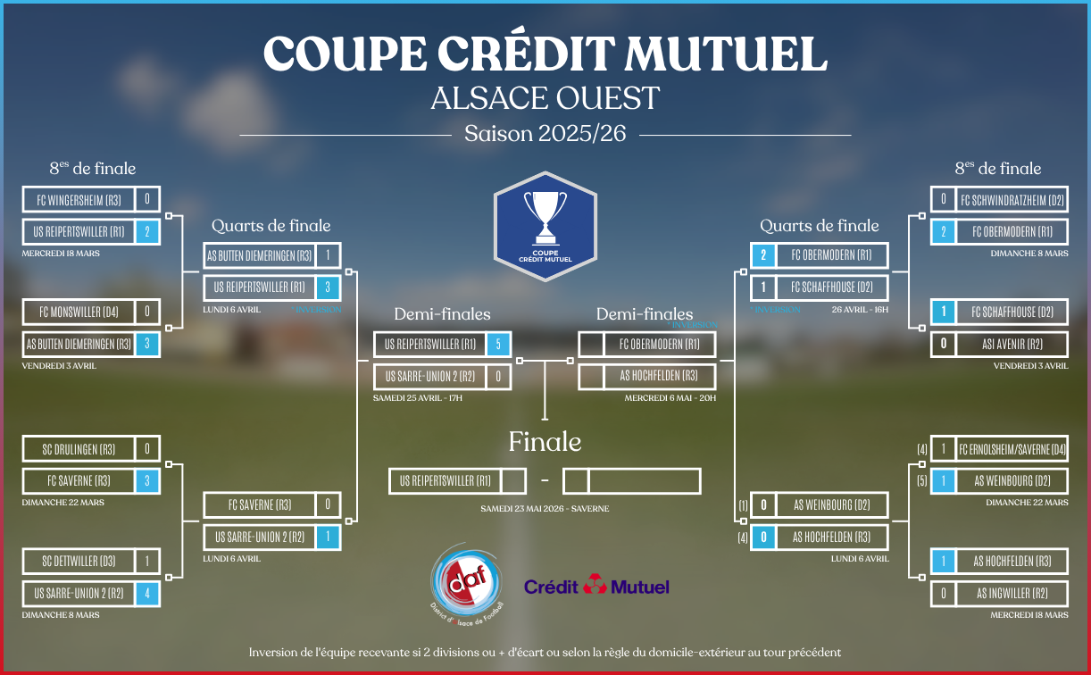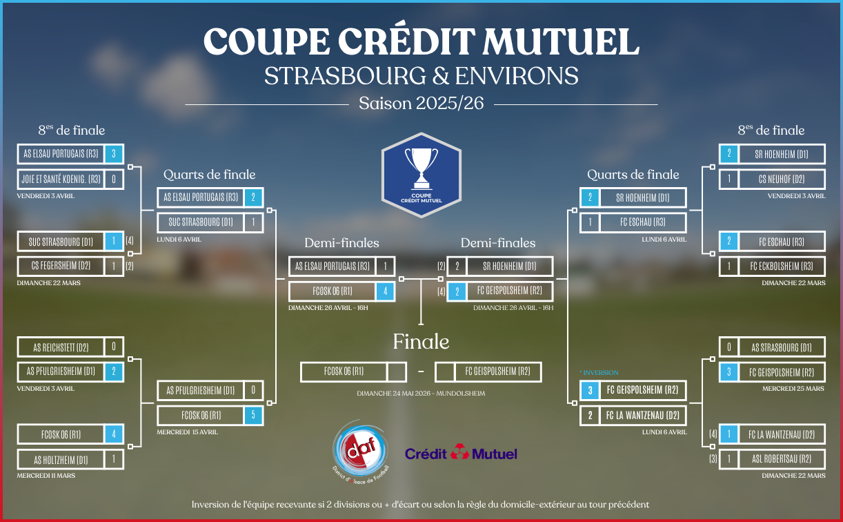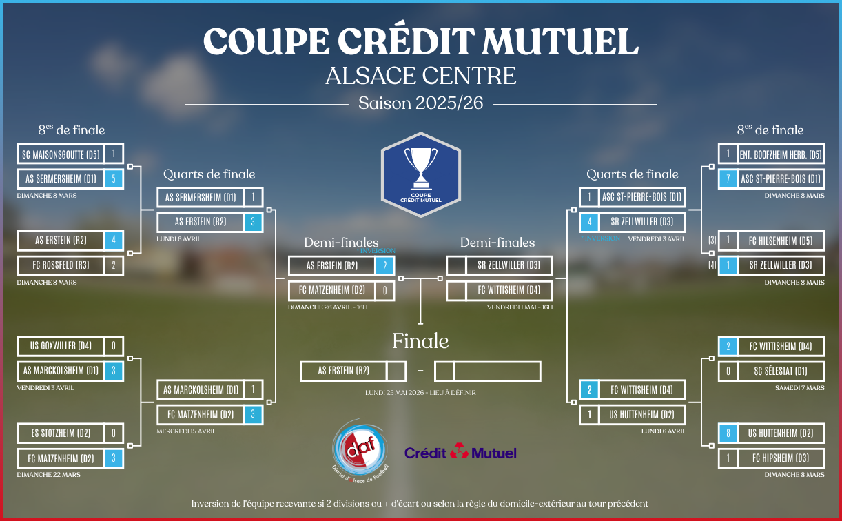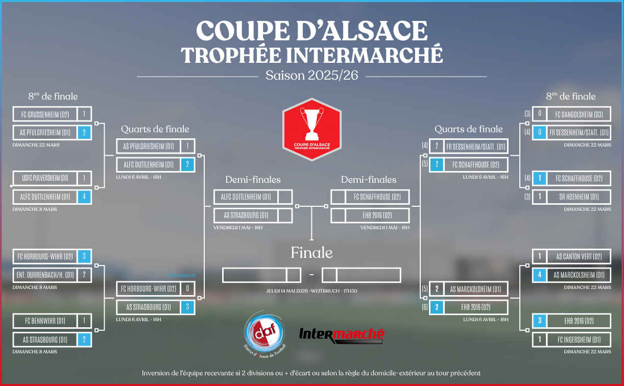 • Le tirage au sort du tableau final (8es, quarts, demi-finales) de la coupe d’Alsace – Trophée Intermarché est programmé le mardi 10 mars 2026 à 19h30 à la Maison Klipfel à Barr, en présence des clubs. Il sera à suivre en direct à partir de 19h30 sur la page Facebook du District d’Alsace de Football.