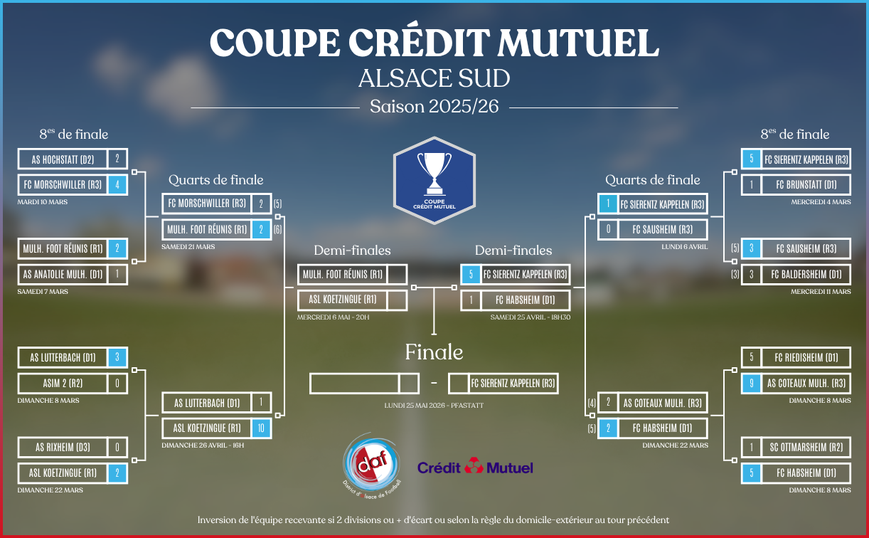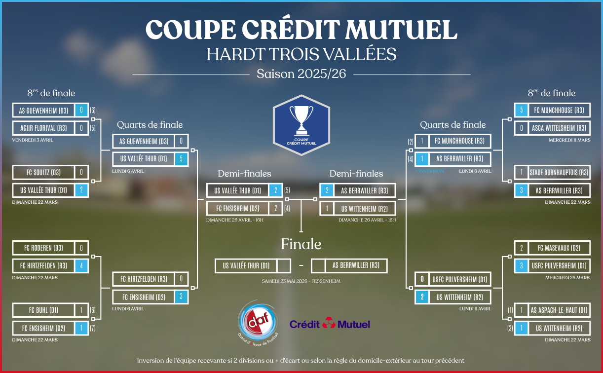 • Les tirages au sort des tableaux finaux (8es, quarts, demi-finales) des coupes du Crédit Mutuel Hardt-3-Vallées, Alsace Sud et Sundgau sont programmés le lundi 23 février à 19h30 à l’Espace 110 à Illzach, en présence des clubs. Ils seront à suivre en direct à partir sur la page Facebook du District d’Alsace de Football.