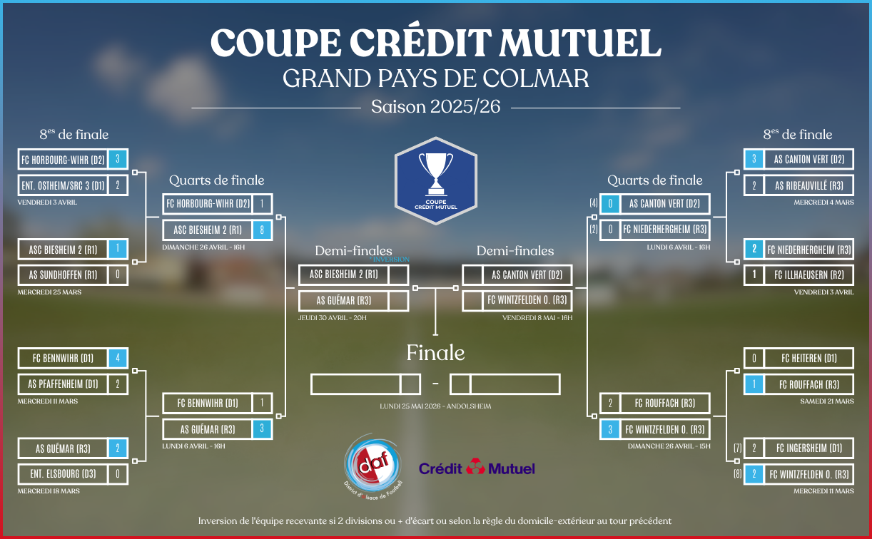 • Les tirages au sort du tableau final (quarts & demi-finales) des coupes d’encouragement Crédit Mutuel Jeunes sont programmés le mardi 17 mars 2026 à 12h au siège du District d’Alsace de Football à Illzach, hors présence des clubs. Ils seront à suivre en direct à partir sur la page Facebook du District d’Alsace de Football.
