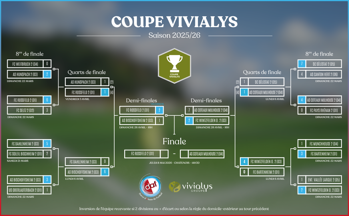 • Le tirage au sort du tableau final (8es, quarts, demi-finales) de la coupe Vivialys est programmé le jeudi 5 mars 2026 à 12h au siège du District d’Alsace de Football à Entzheim, hors présence des clubs. Il sera à suivre en direct à partir sur la page Facebook du District d’Alsace de Football.