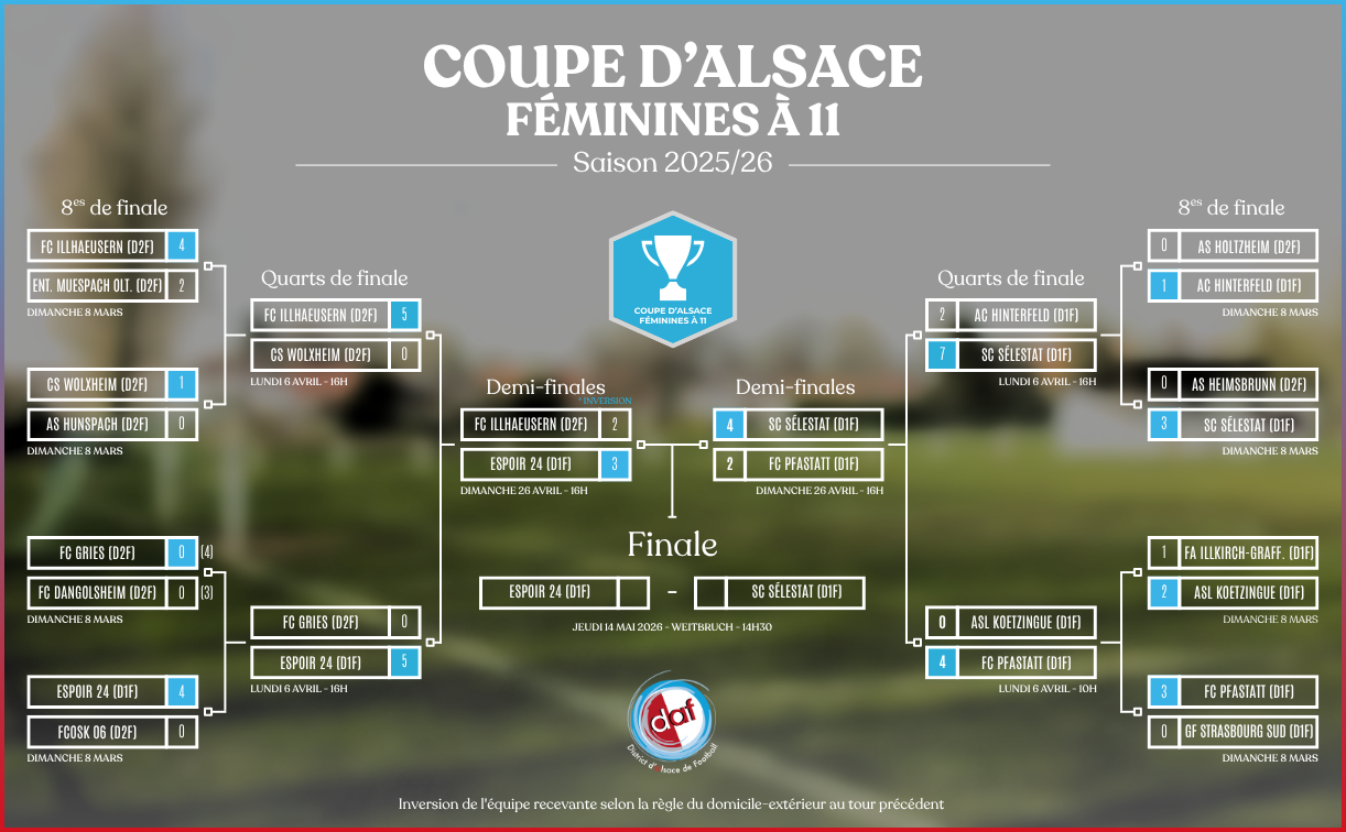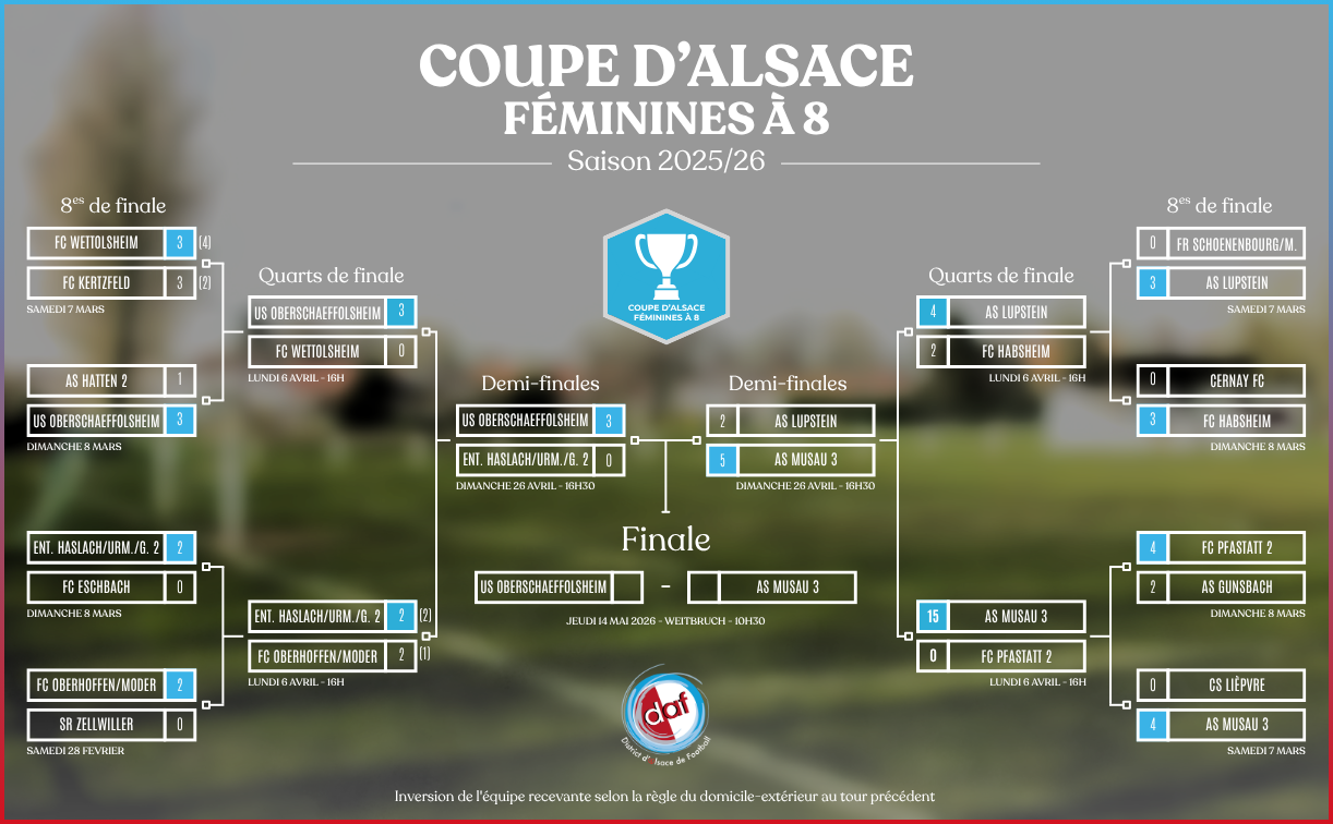 • Le tirage au sort des tableaux finaux des coupes d’Alsace féminines sont programmés le lundi 9 février 2026 à 19h30 à L’Etincelle à Sélestat, en présence des clubs. Il sera à suivre en direct à partir de 19h30 sur la page Facebook du District d’Alsace de Football.