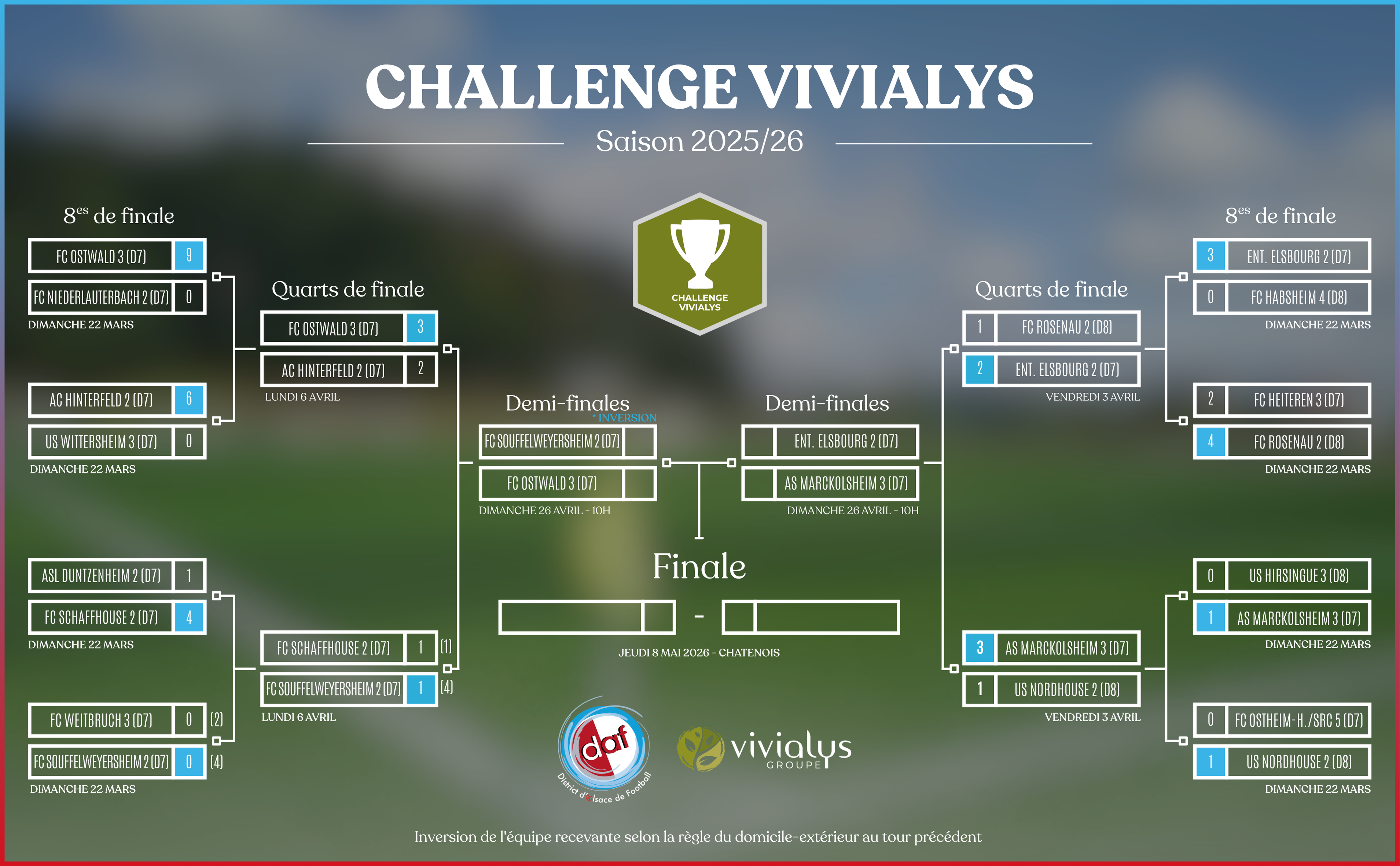 - Le tirage au sort du tableau final (8es, quarts, demi-finales) du Challenge Vivialys est programmé le jeudi 5 mars 2026 à 12h au siège du District d’Alsace de Football à Entzheim, hors présence des clubs. Il sera à suivre en direct à partir sur la page Facebook du District d’Alsace de Football.