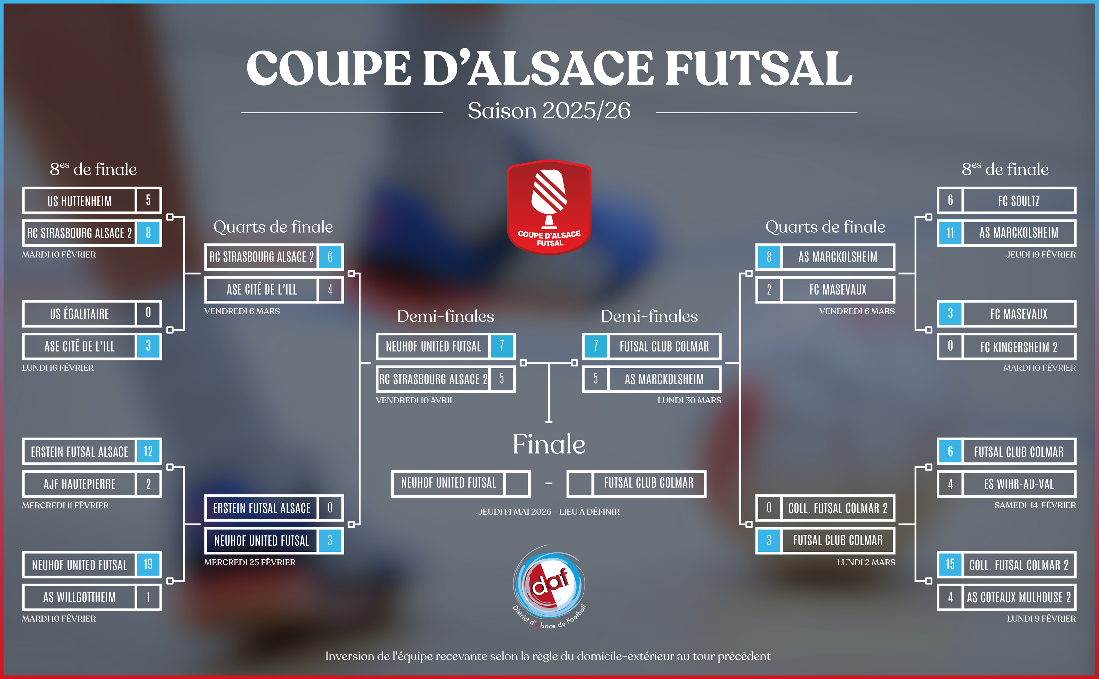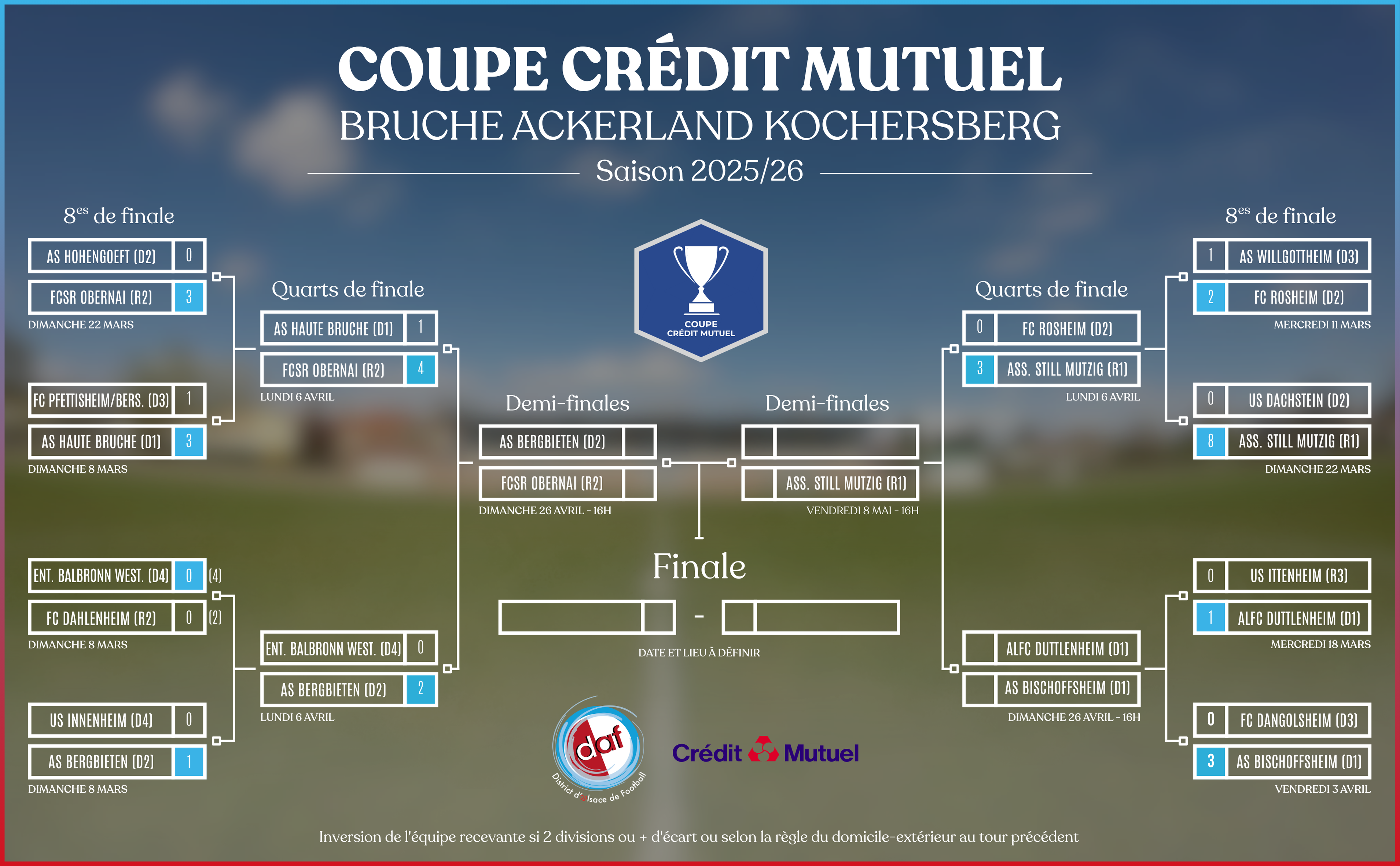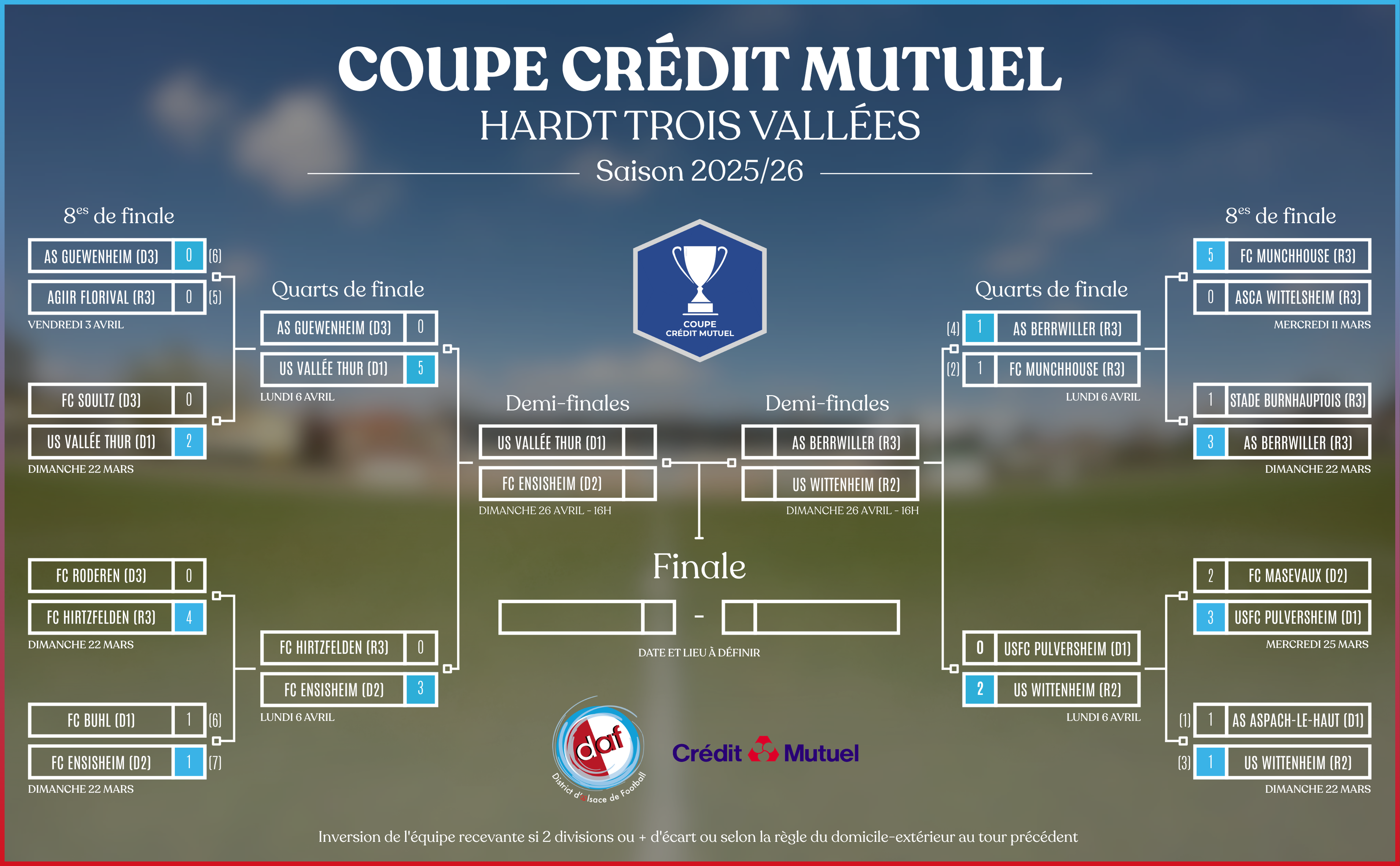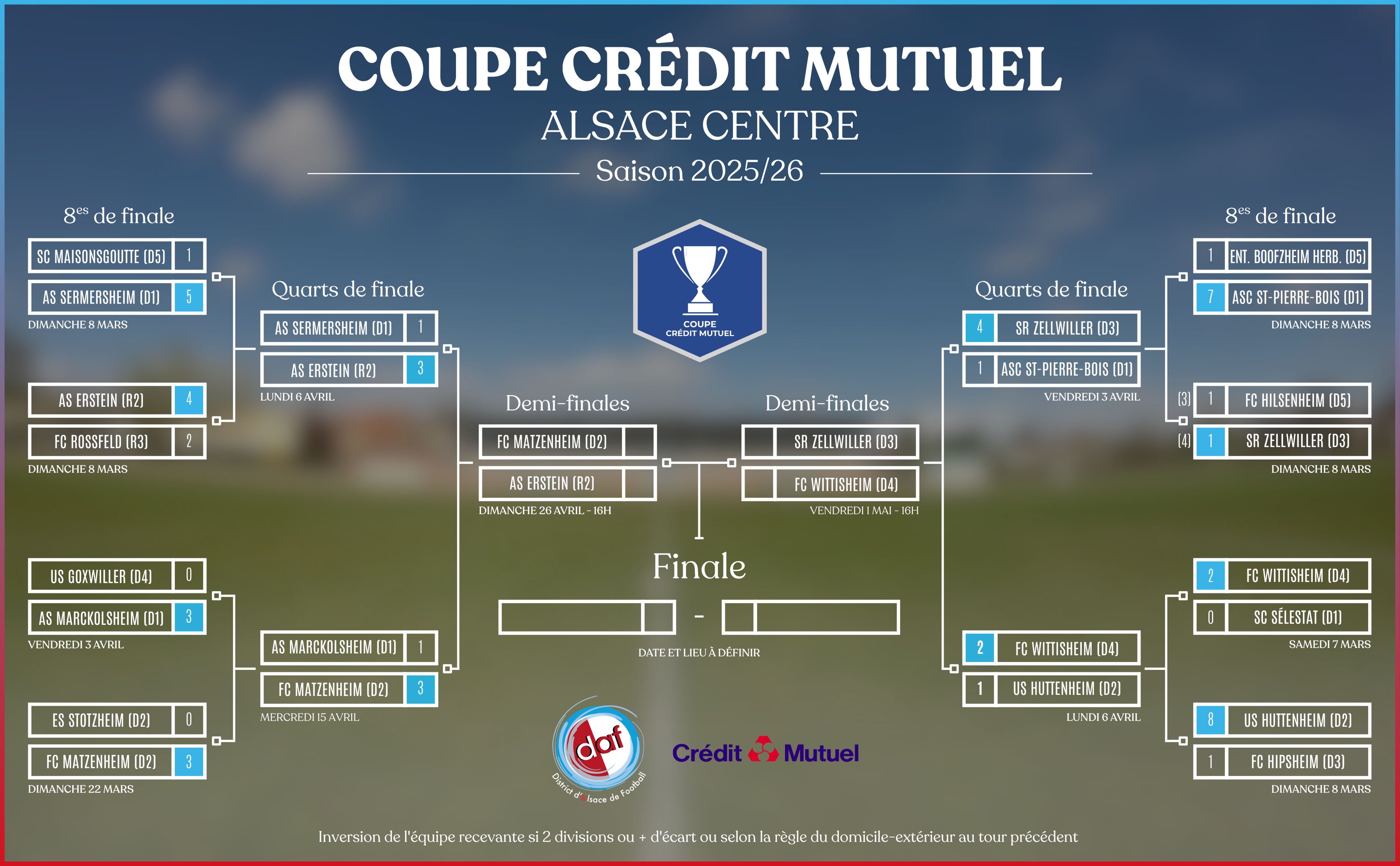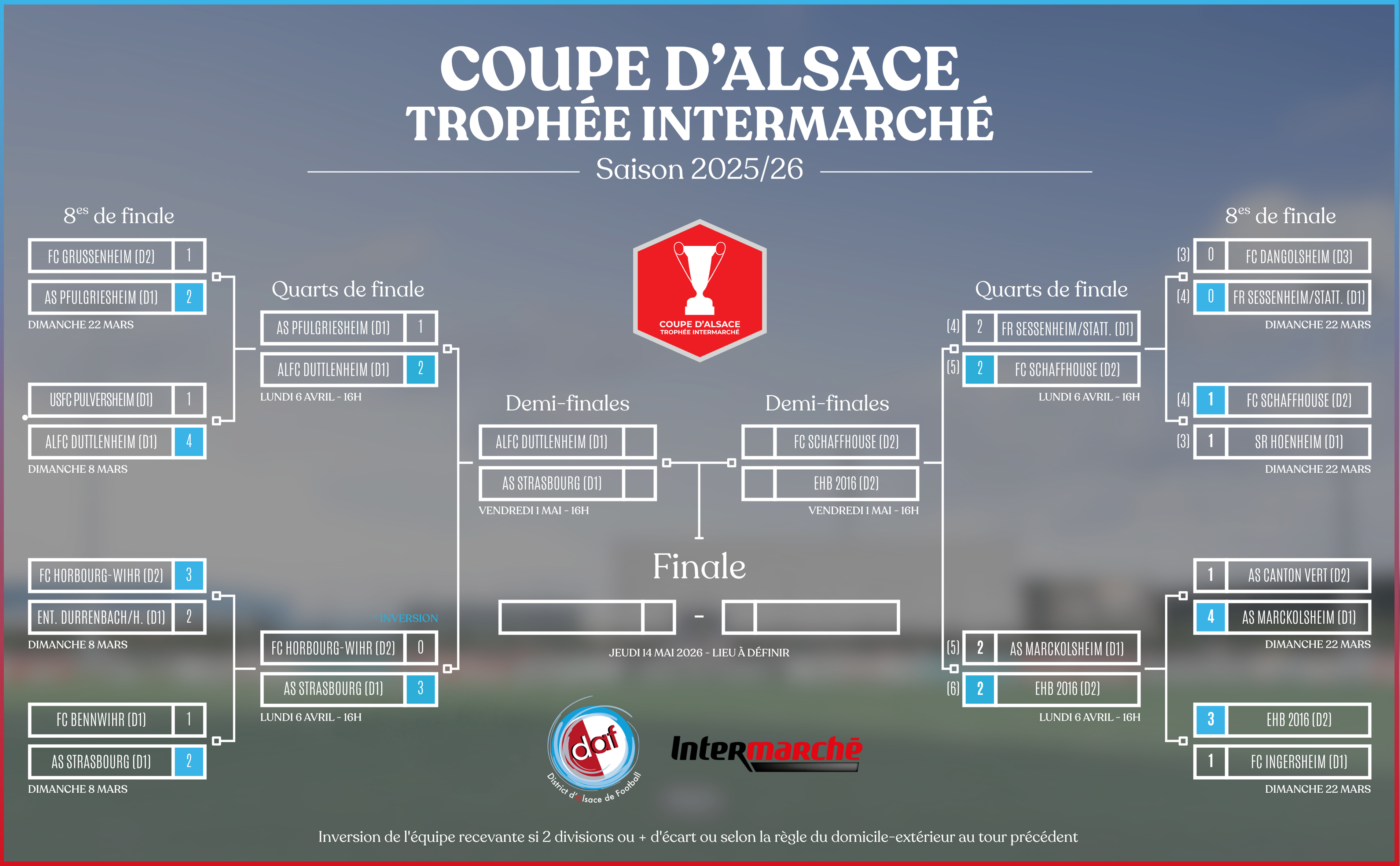 - Le tirage au sort du tableau final (8es, quarts, demi-finales) de la coupe d’Alsace – Trophée Intermarché est programmé le mardi 10 mars 2026 à 19h30 à la Maison Klipfel à Barr, en présence des clubs. Il sera à suivre en direct à partir de 19h30 sur la page Facebook du District d’Alsace de Football.