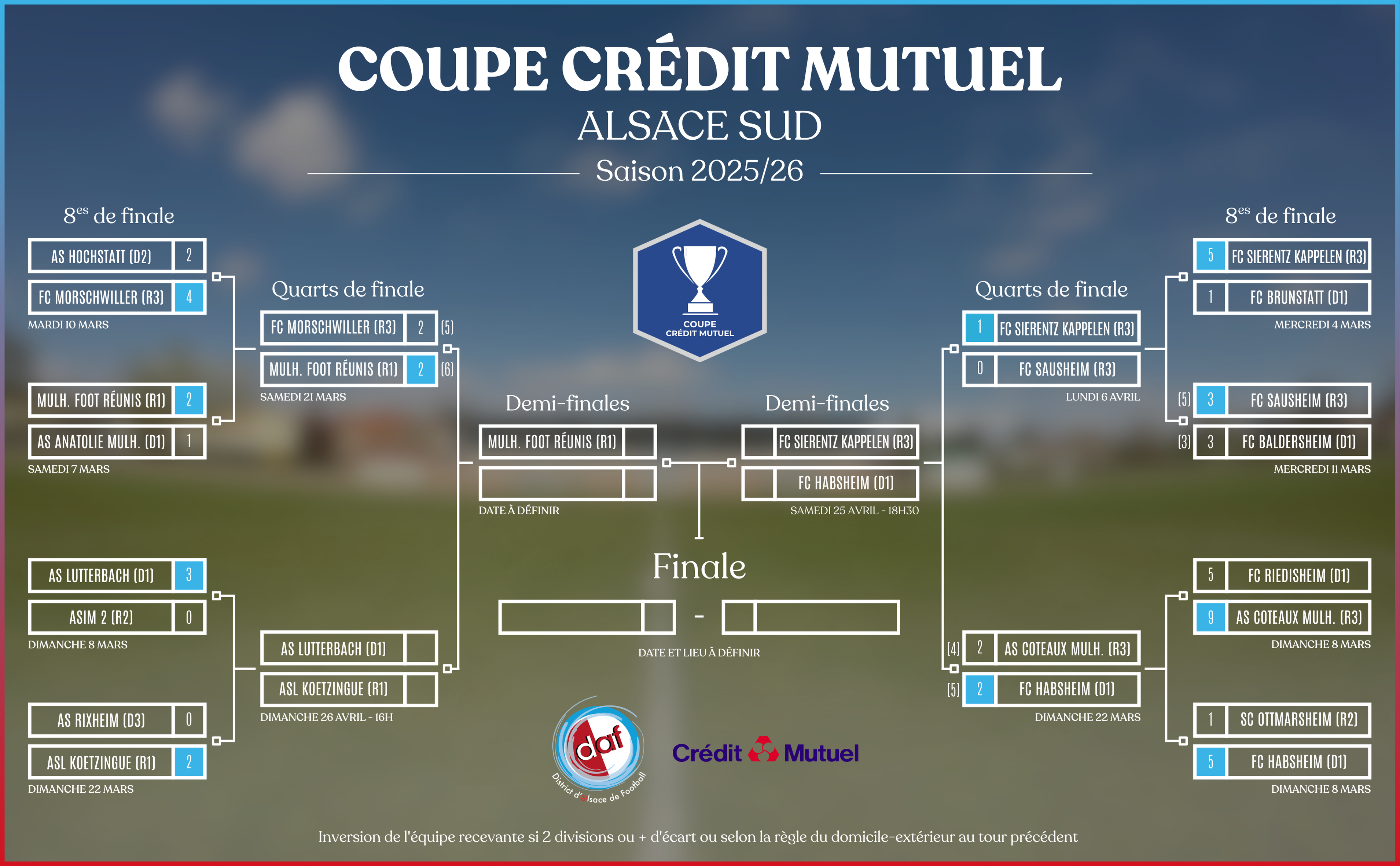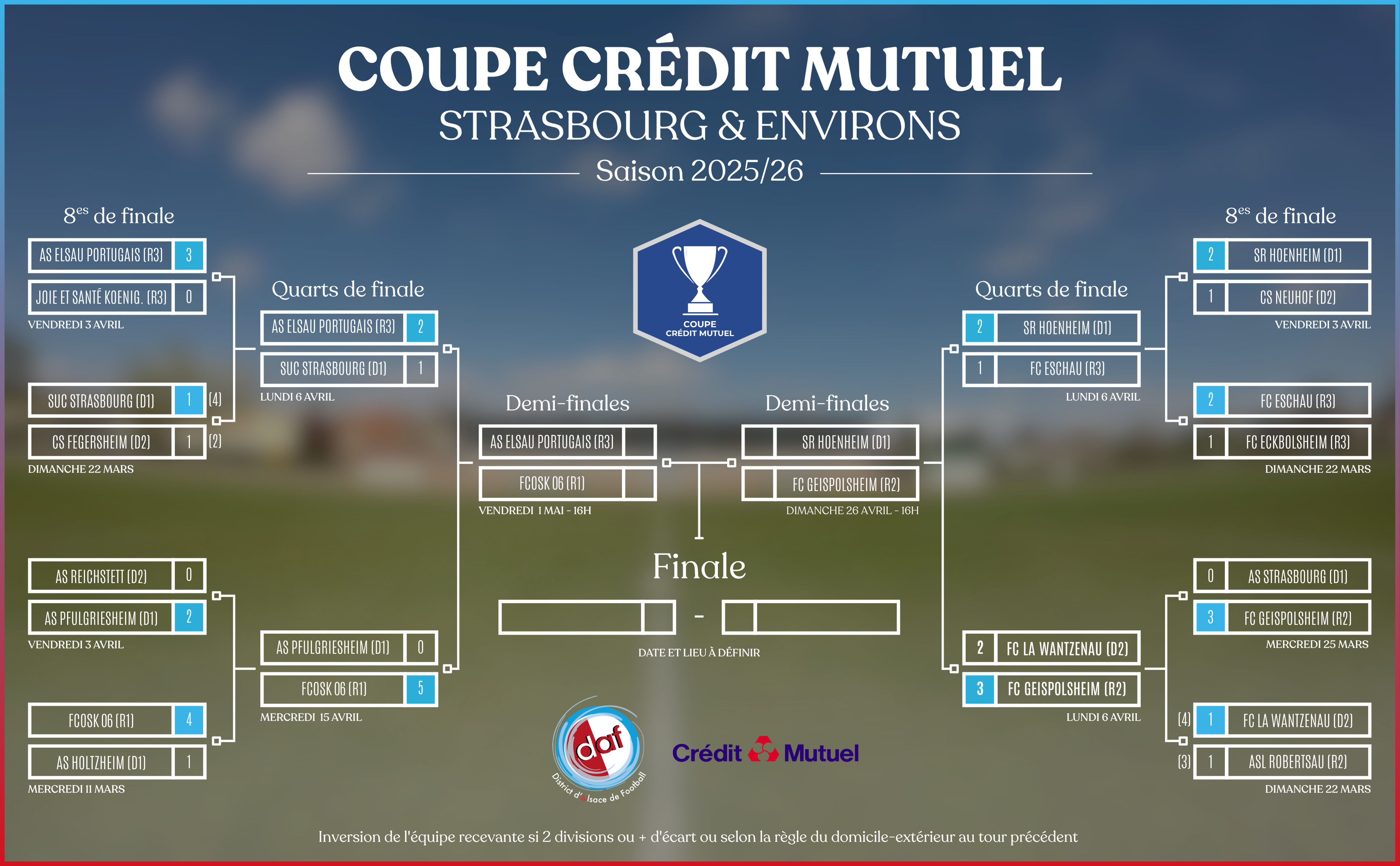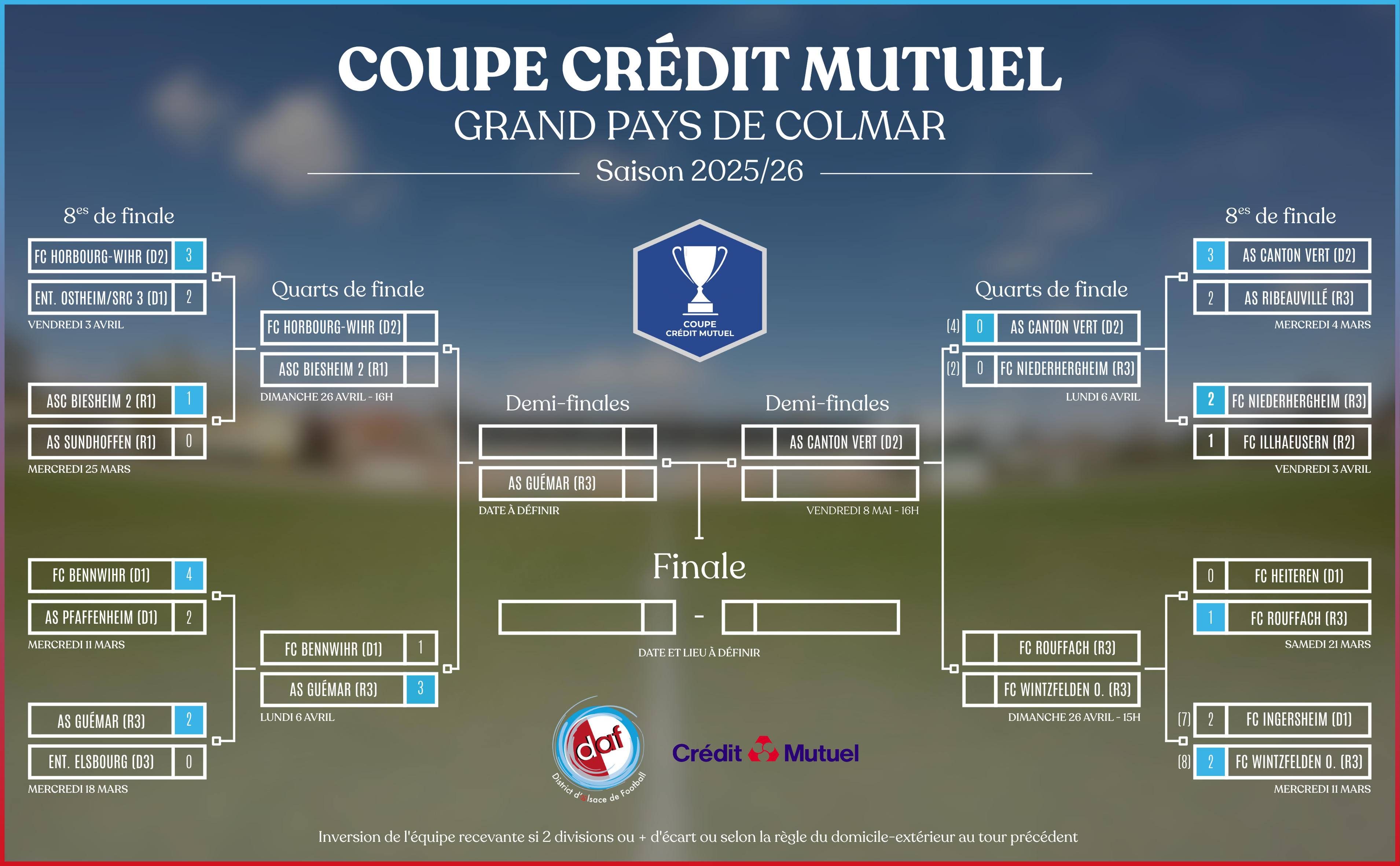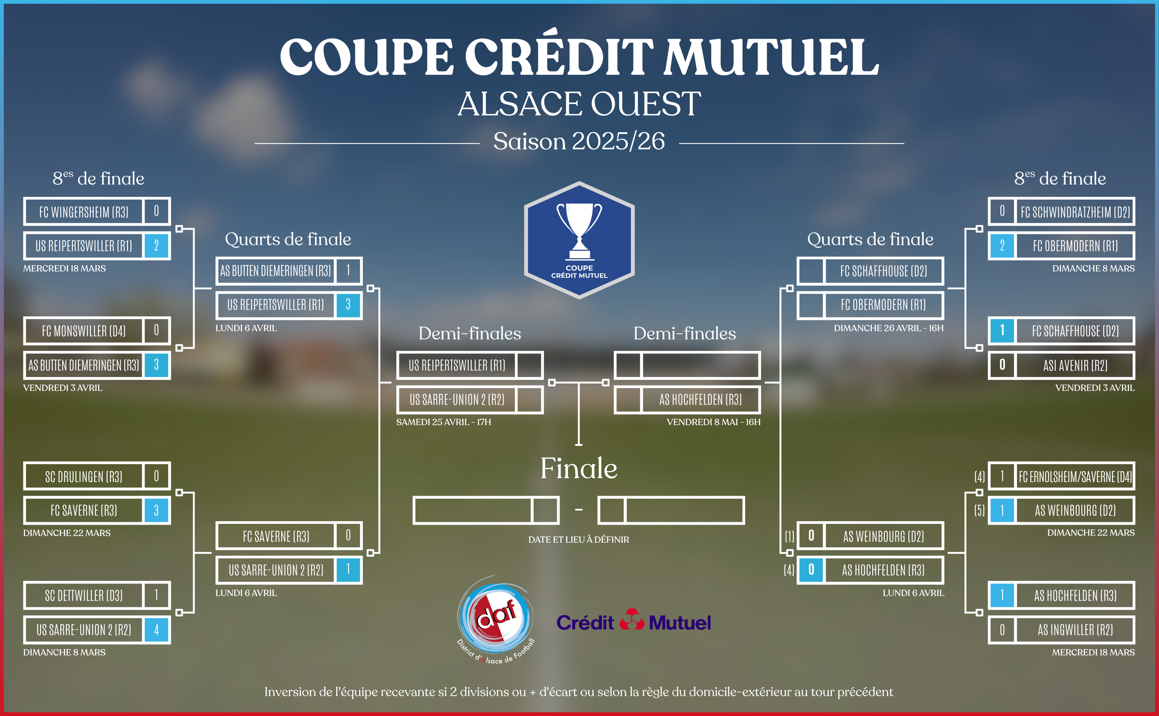 - Les tirages au sort du tableau final (quarts & demi-finales) des coupes d’encouragement Crédit Mutuel Jeunes sont programmés le mardi 17 mars 2026 à 12h au siège du District d’Alsace de Football à Illzach, hors présence des clubs. Ils seront à suivre en direct à partir sur la page Facebook du District d’Alsace de Football.