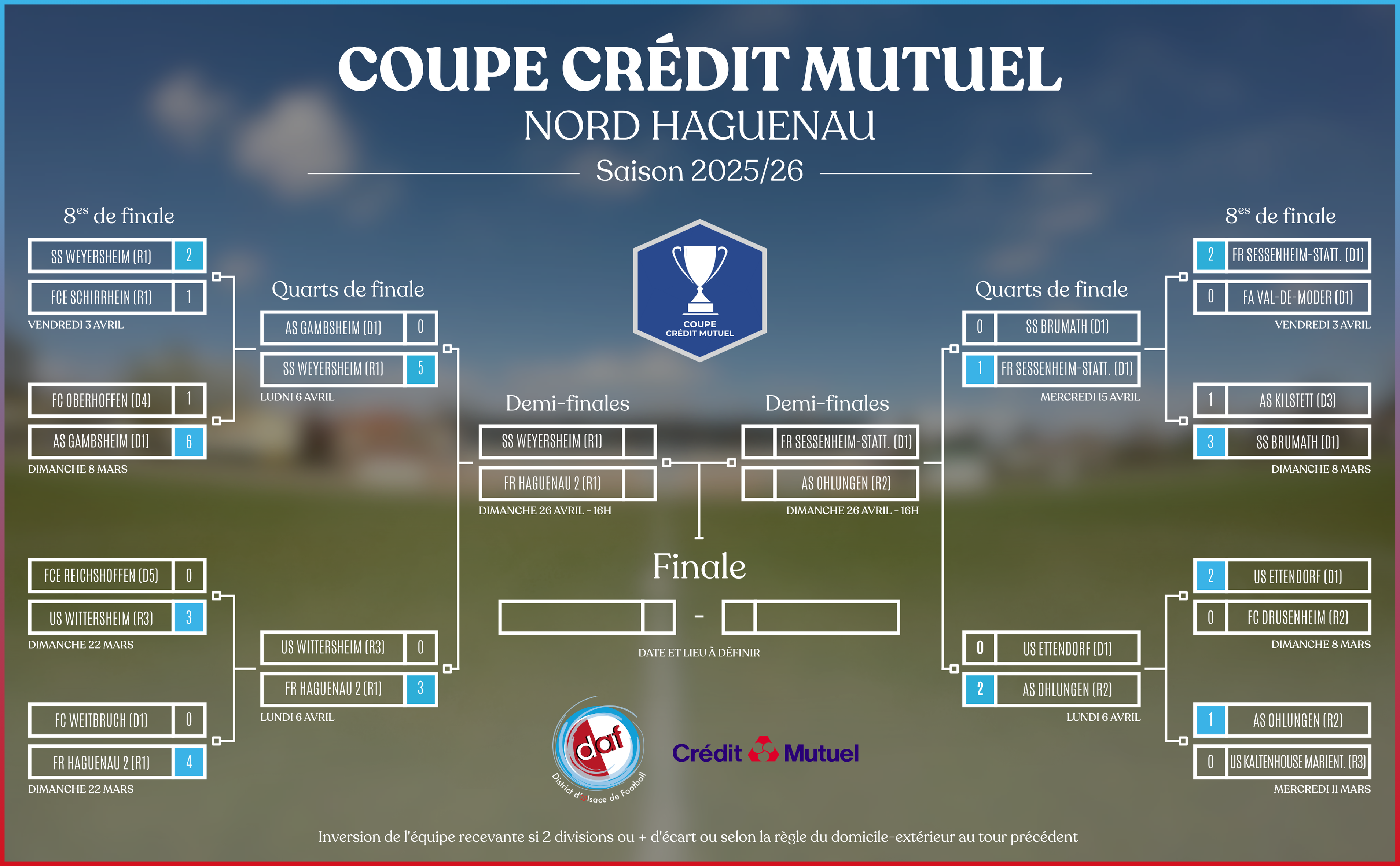 - Les tirages au sort des tableaux finaux (8es, quarts, demi-finales) des coupes du Crédit Mutuel Ouest, Nord Wissembourg, Nord Haguenau et Strasbourg & Environs sont programmés le jeudi 26 février à 19h30 au centre culturel Bernard Schreiner à Brumath, en présence des clubs. Ils seront à suivre en direct à partir sur la page Facebook du District d’Alsace de Football.