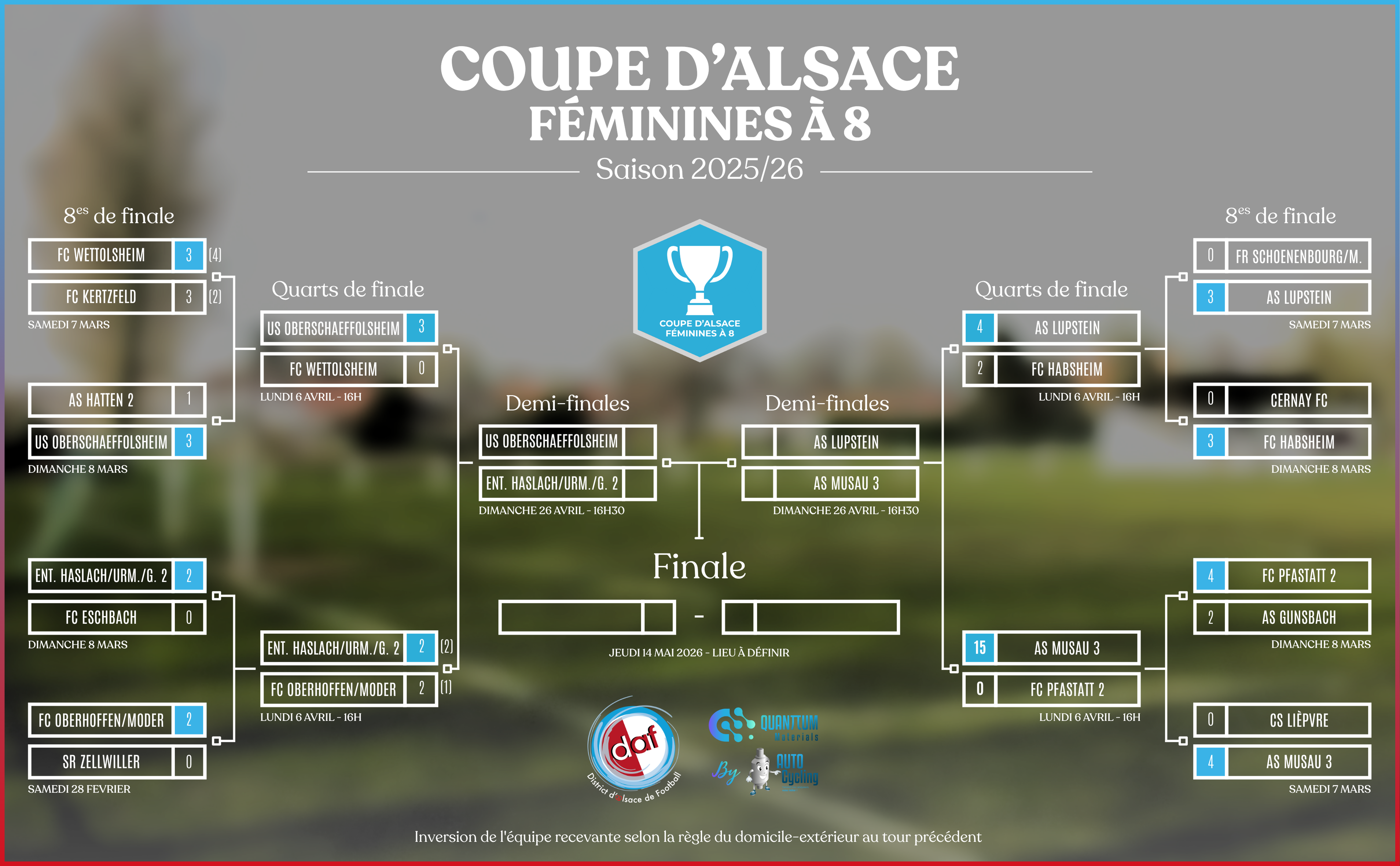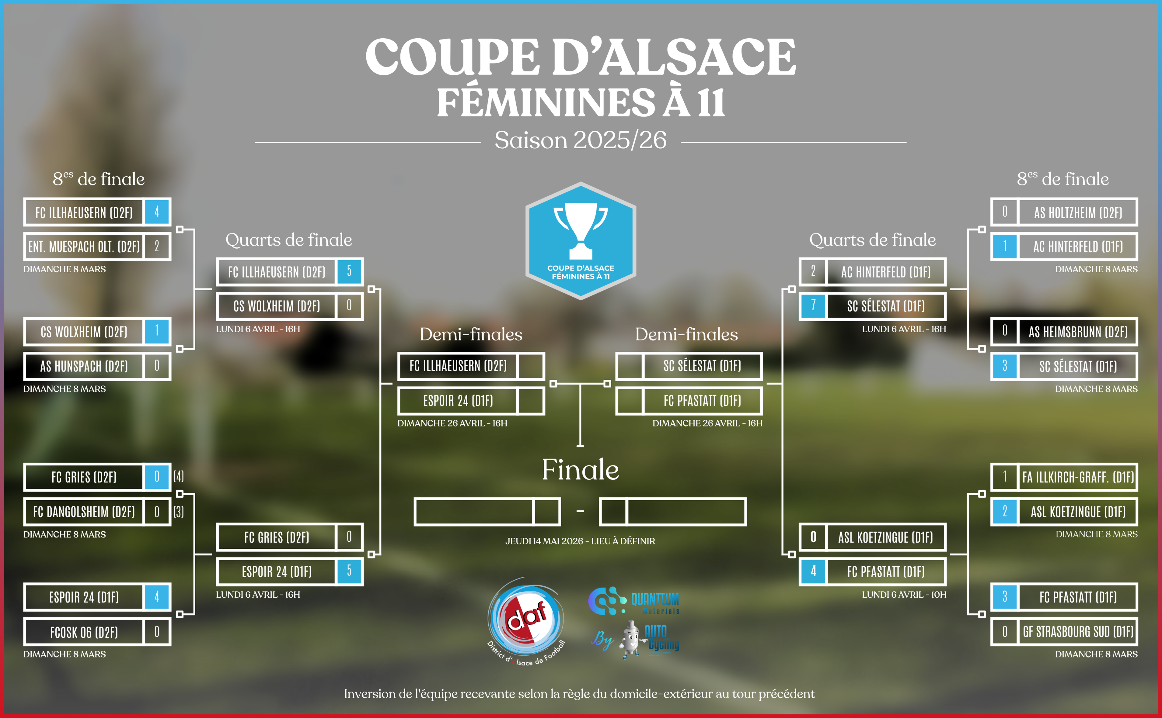 - Le tirage au sort des tableaux finaux des coupes d’Alsace féminines sont programmés le lundi 9 février 2026 à 19h30 à L’Etincelle à Sélestat, en présence des clubs. Il sera à suivre en direct à partir de 19h30 sur la page Facebook du District d’Alsace de Football.