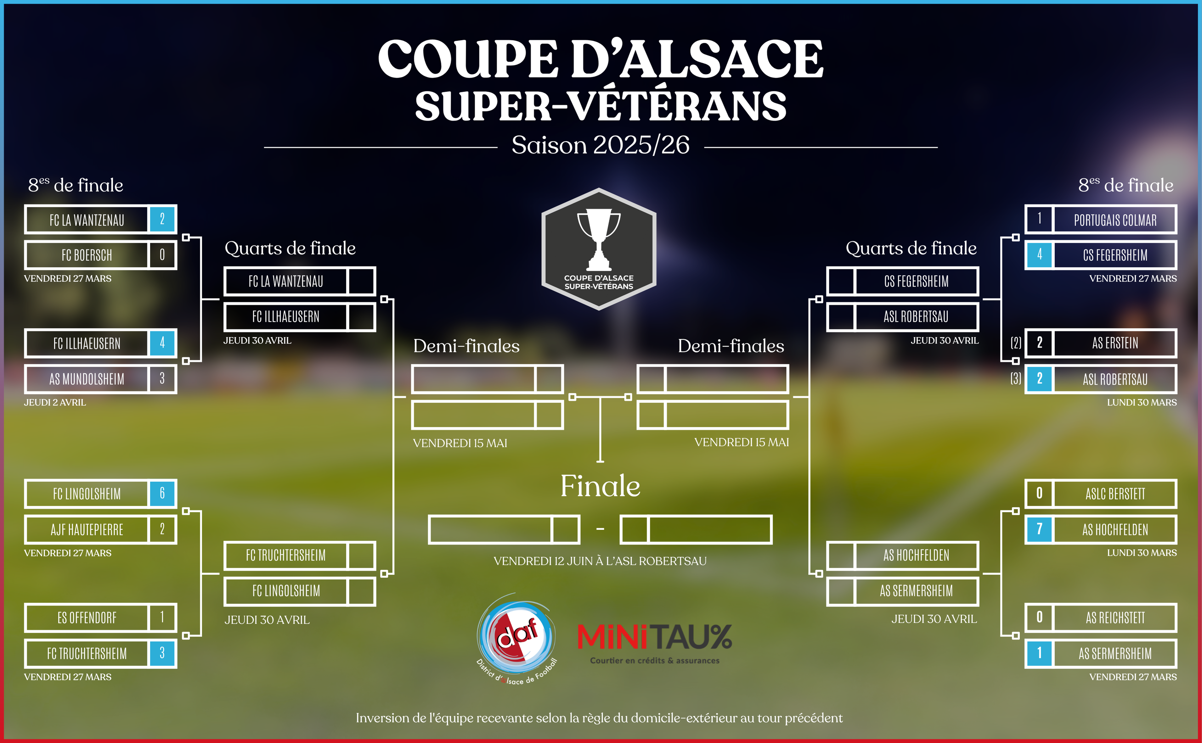 - Le tirage au sort du tableau final (8es, quarts, demi-finales) de la coupe d’Alsace des super-vétérans est programmé le jeudi 12 mars 2026 à 12h au siège du District d’Alsace de Football à Entzheim, hors présence des clubs. Il sera à suivre en direct à partir sur la page Facebook du District d’Alsace de Football.