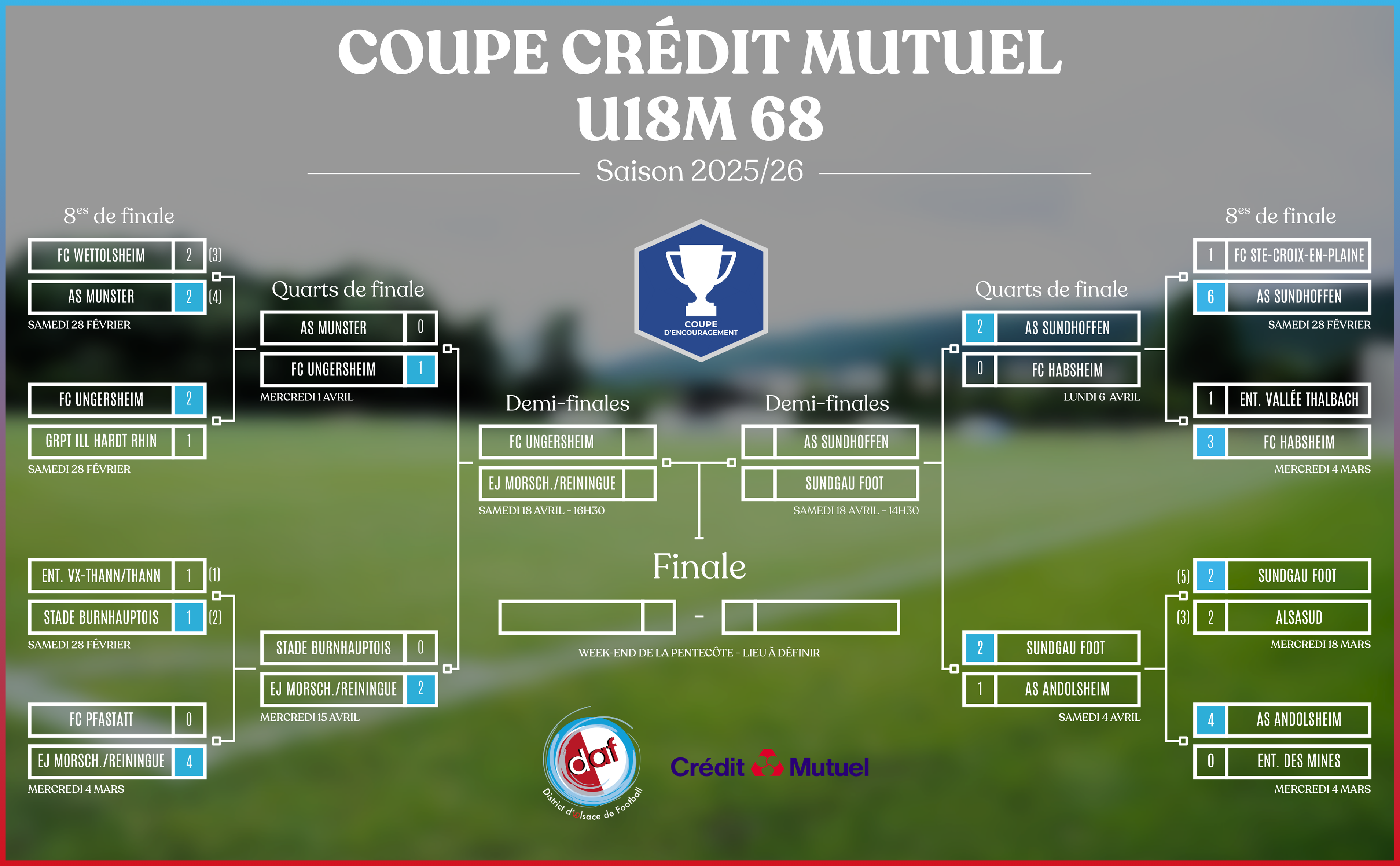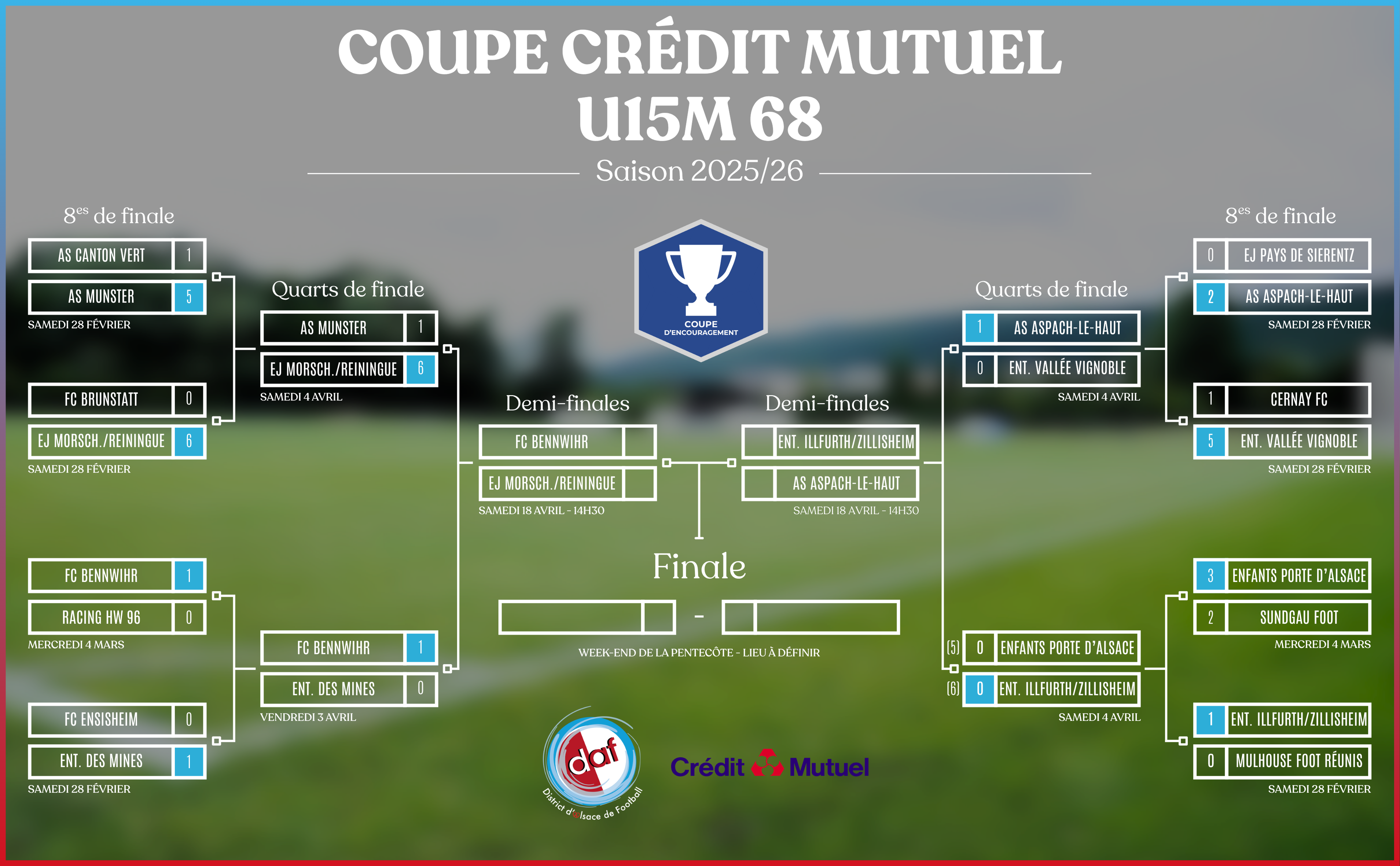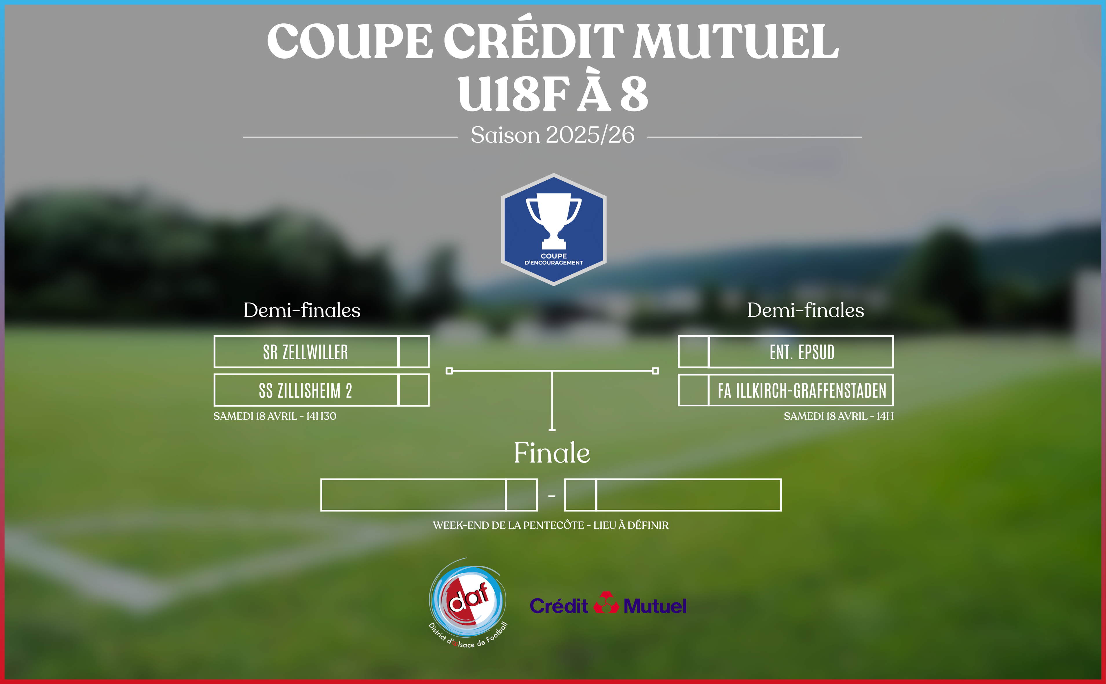 - Les tirages au sort du tableau final (quarts & demi-finales) des coupes d’encouragement Crédit Mutuel Jeunes sont programmés le mardi 17 mars 2026 à 12h au siège du District d’Alsace de Football à Illzach, hors présence des clubs. Ils seront à suivre en direct à partir sur la page Facebook du District d’Alsace de Football.