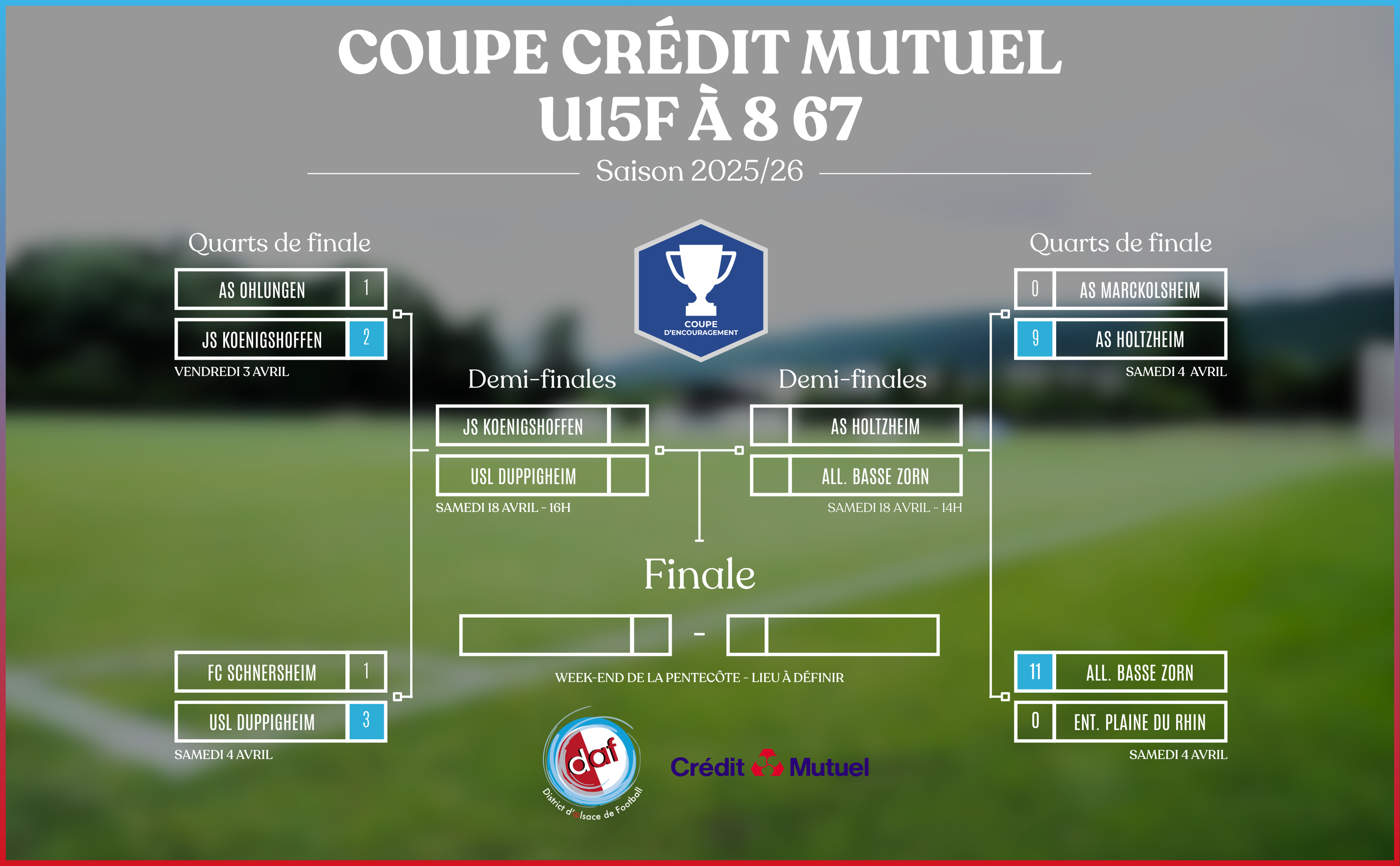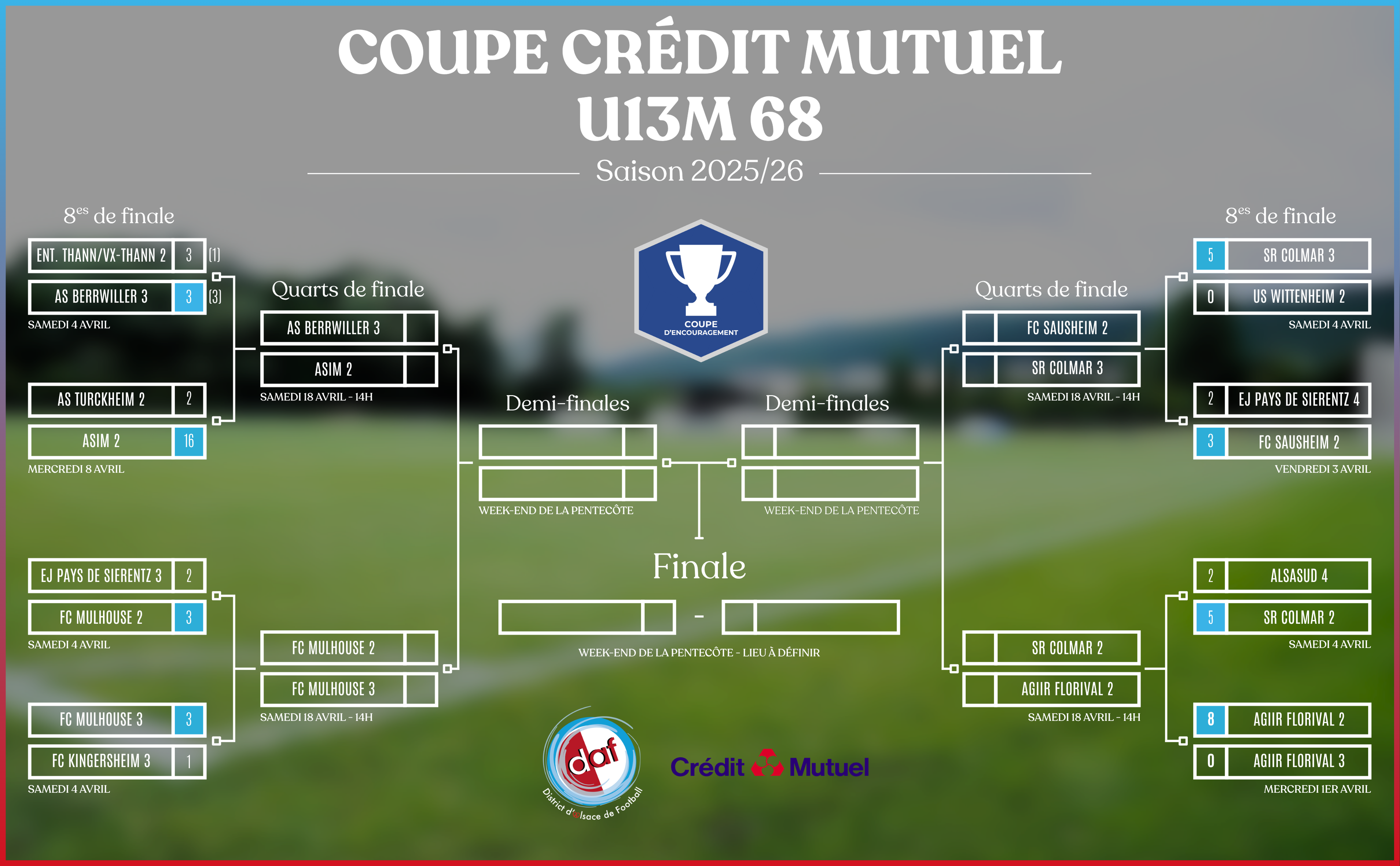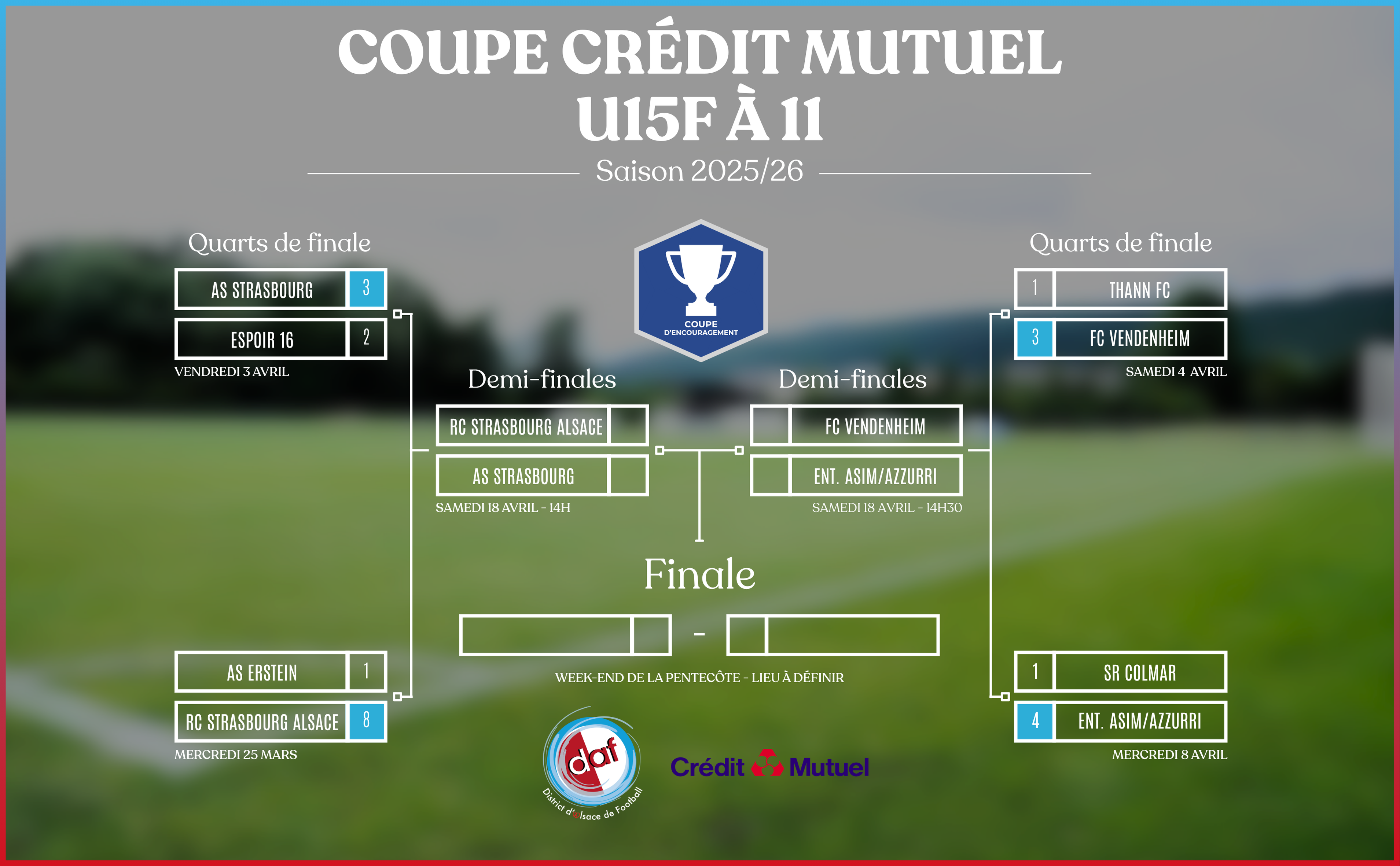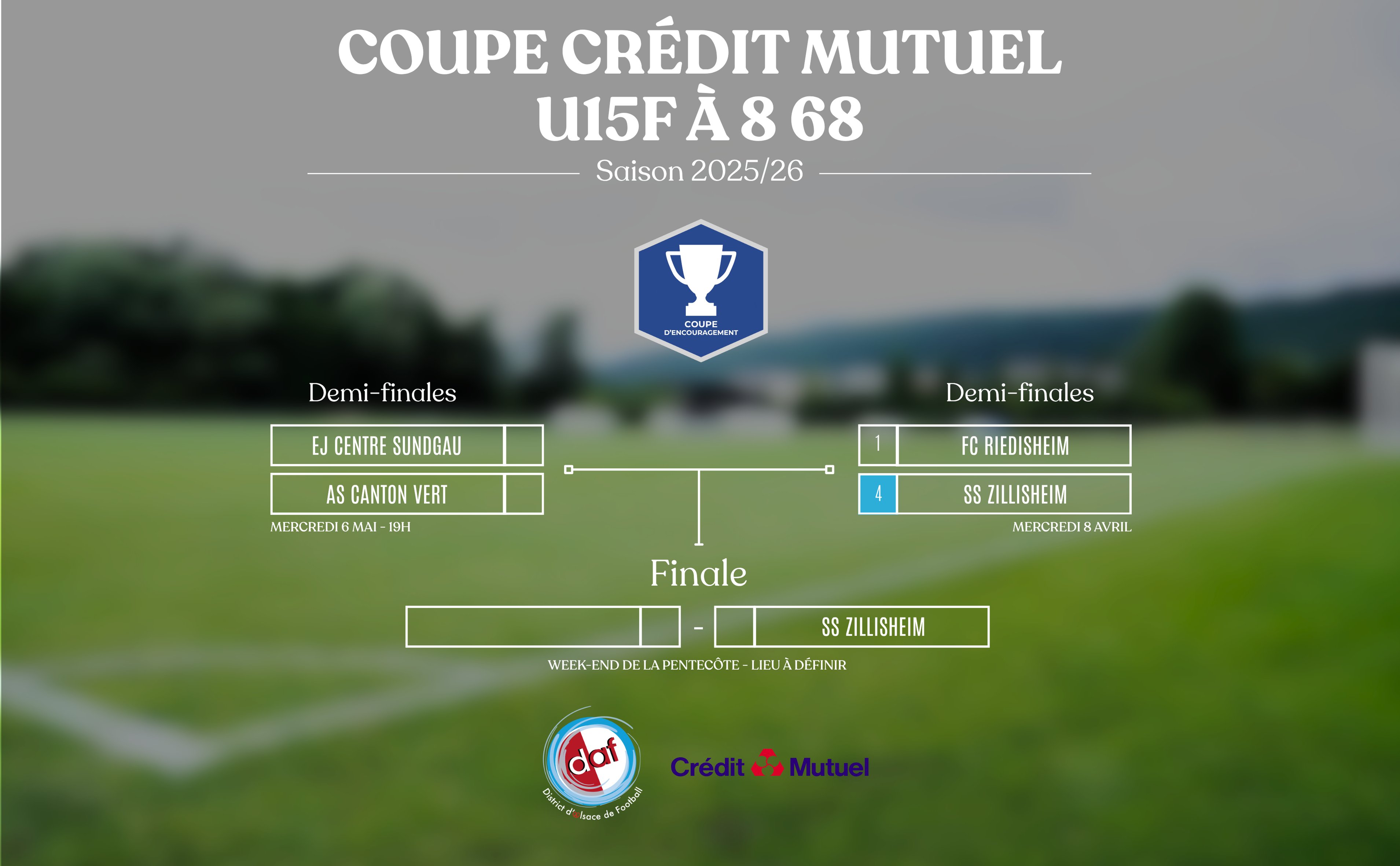 - Les tirages au sort du tableau final (quarts & demi-finales) des coupes d’encouragement Crédit Mutuel Jeunes sont programmés le mardi 17 mars 2026 à 12h au siège du District d’Alsace de Football à Illzach, hors présence des clubs. Ils seront à suivre en direct à partir sur la page Facebook du District d’Alsace de Football.