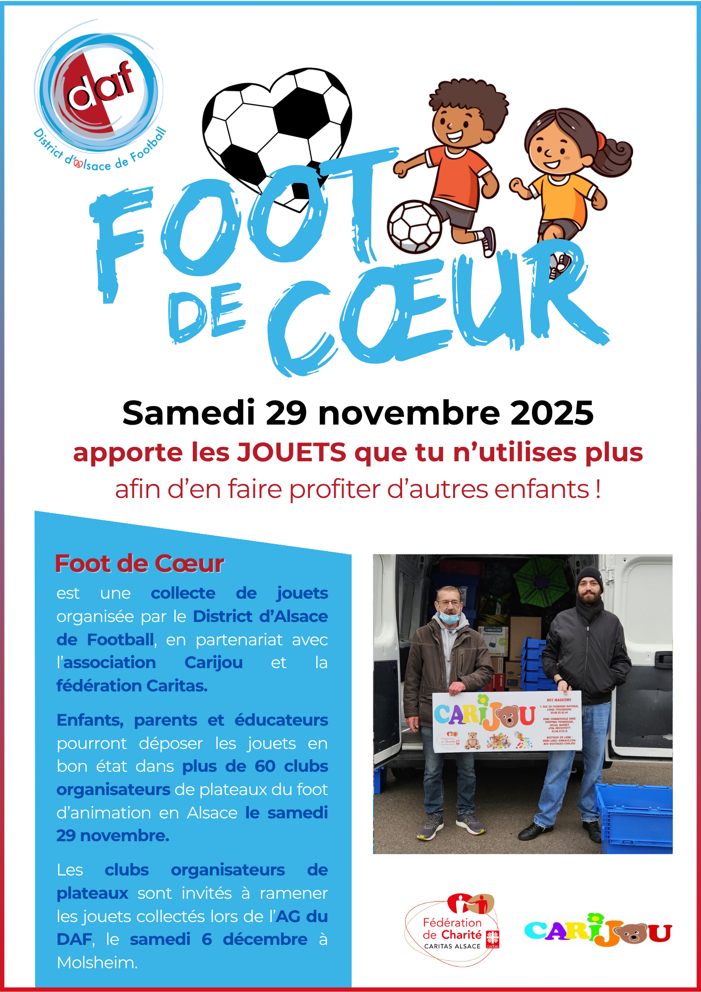 Pour la 7e saison consécutive, le District d’Alsace de Football organise, en partenariat avec la fédération de charité Caritas Alsace et l’association Carijou, une grande collecte de jouets à l’occasion des plateaux de Noël du foot d’animation programmés le samedi 29 novembre. Baptisée « Foot de Cœur », cette opération s’adresse principalement aux jeunes pratiquants et pratiquantes de toutes les catégories du football d’animation mais aussi à leurs parents et éducateurs. Explications.