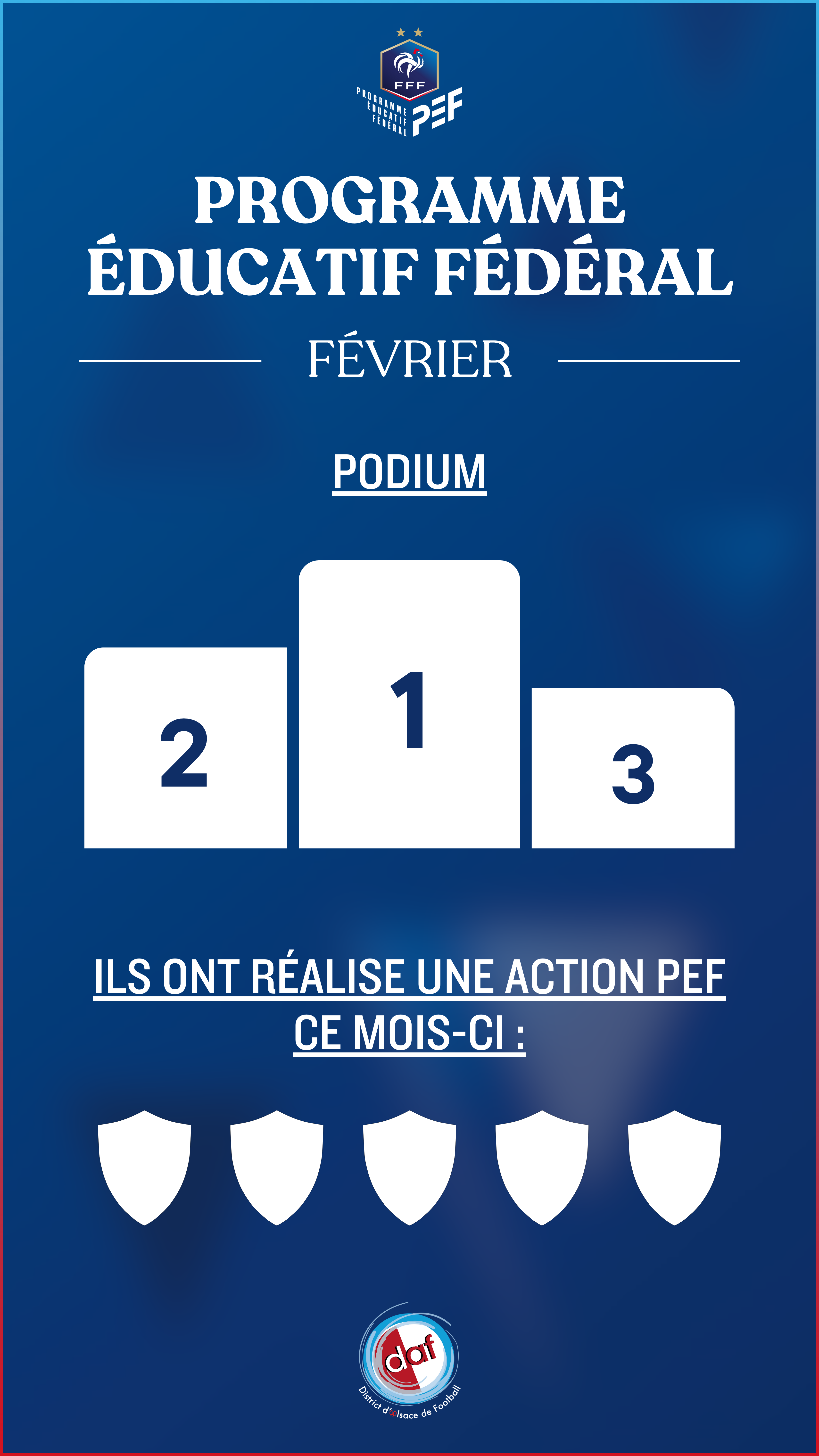 Les clubs inscrits au Programme Éducatif Fédéral participent automatiquement au Challenge national PEF. Le dépôt des fiches actions par les clubs est ouvert jusqu’au 30 avril 2026. Un jury départemental (mi-mai 2026) établira un classement entre les clubs ayant déposé des actions pour élire le lauréat au sein du District d’Alsace.