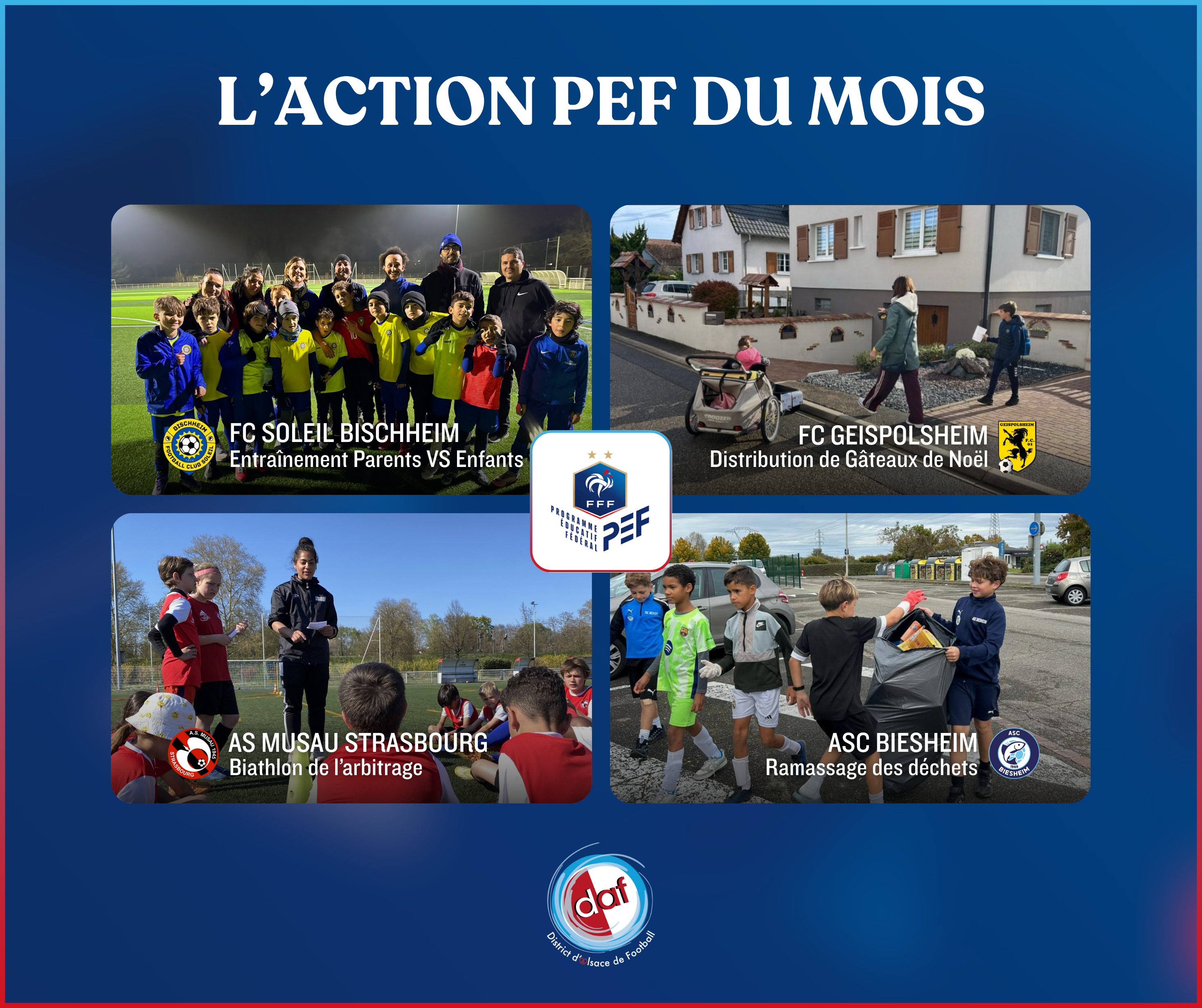 Chaque dernier mercredi du mois, des opérations PEF seront mises en avant sur les réseaux sociaux du District d’Alsace de Football (ex-ci-dessous) afin de valoriser les clubs qui participeront activement au dispositif, avec de jolies dotations matériel à la clé.