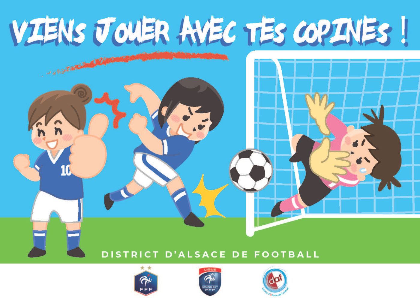 Afin de donner un coup d’accélérateur au développement de la pratique féminine, et notamment au football d’animation féminin (U7F-U9F & U11F), le District d’Alsace de Football déploiera le 6 mai prochain l’opération « Viens jouer avec tes copines ». Des journées portes ouvertes organisées par les clubs volontaires qui ont une école de football féminine ou qui souhaitent en développer une. Explications et inscriptions.